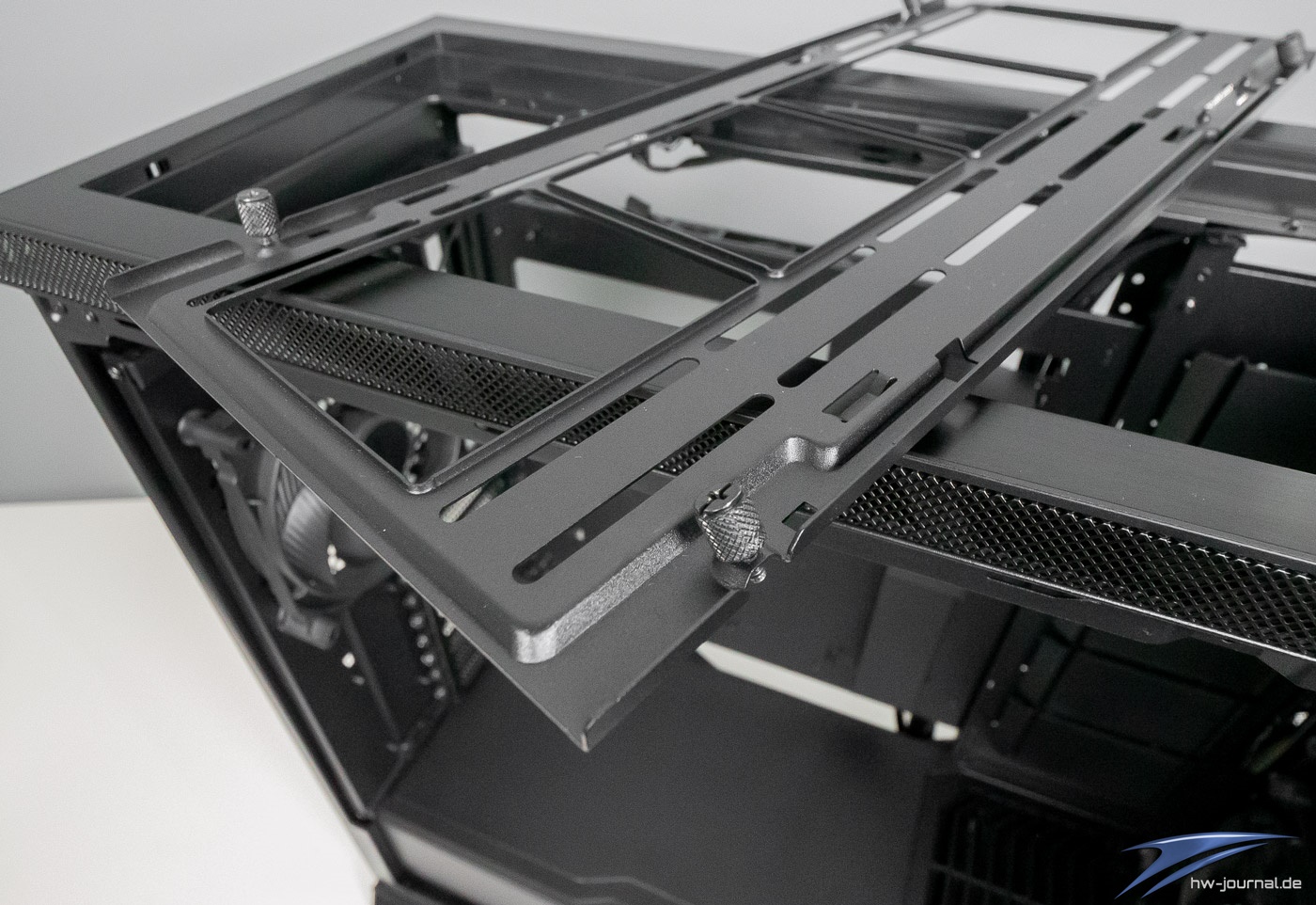 Die beiden zusätzlichen Elemente sind auch mit Dämmmaterial versehen und wollen so der allgemeinen Akustik zuträglich sein. Direkt darunter befindet sich ein weiteres Halte-Bracket für Lüfter und Radiatoren. Es kann komfortabel mit Rändelschrauben gelöst und leicht entnommen werden. So lassen sich also auch etwaige Lüfter oder Wärmetauscher sehr bequem extern montieren und dann final platzieren. Auch hier hat man wieder einen kleinen Lüfter-Hub untergebracht, sodass die angeschlossenen Ventilatoren nur einen kurzen Kabelweg benötigen. Der Hub-Selbst wird über Kontakte mit Strom versorgt und kommt ohne nerviges Kabelgewirr aus.