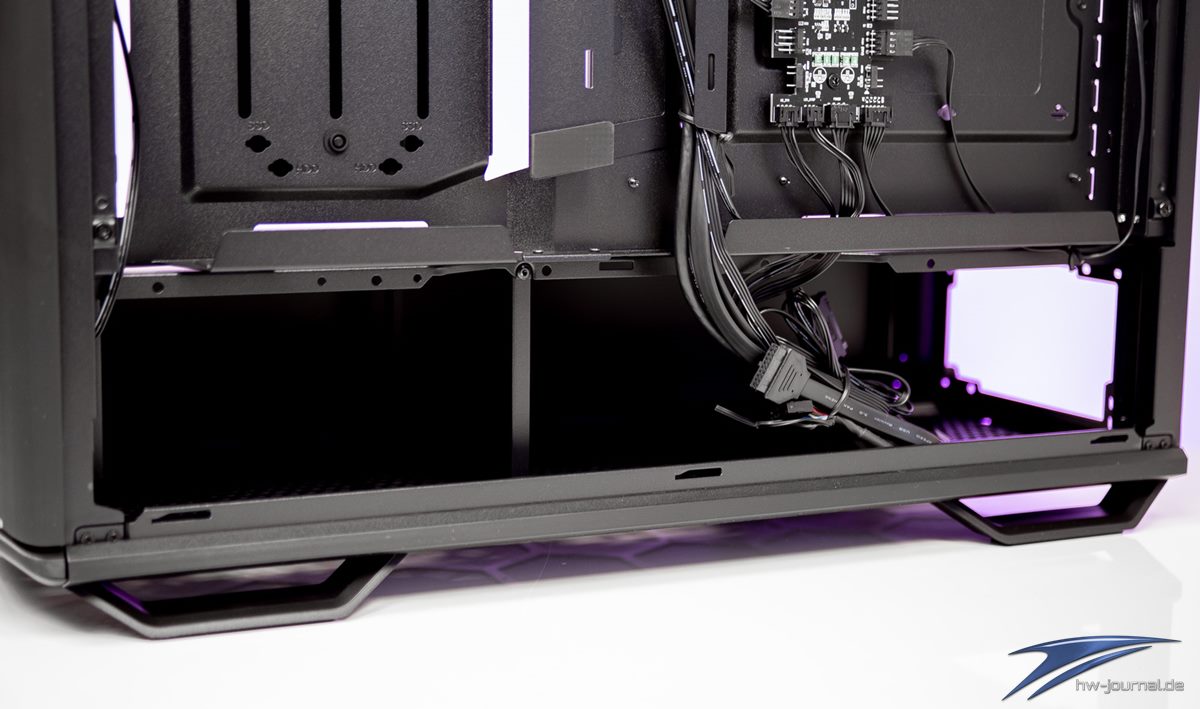Werfen wir die Blicke in den unteren Bereich bzw. auf die Rückseite. Wie schon mehrfach angesprochen, haben wir ein Doppelkammersystem, bei dem der PSU-Tunnel für Datenträger und das Verstauen der Kabel bzw. des Netzteils vorgesehen ist. Letzteres darf sogar bis zu 250 mm lang sein, also überdurchschnittlich groß. Dank des mitgelieferten Halterahmens für den unteren Bereich kann hier auch eine 3,5 Zoll HDD verbaut werden. Allerdings muss man sich diesen Rahmen für rund 6 Euro nachkaufen, da er nicht im Lieferumfang enthalten ist. Wahlweise gibt es diesen, wie das gesamte Gehäuse, in Schwarz oder Weiß.