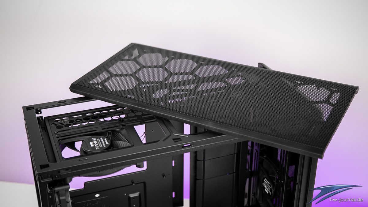 Das Oberteil hat ebenfalls ein großes Meshgitter erhalten, was dem angedachten Airflow-Konzept zugutekommen soll. Die Kunststoffbereiche drumherum haben die Optik von poliertem Aluminium erhalten. Der Deckel lässt sich mittels Lösung von zwei Rändelschrauben ganz einfach abnehmen, sodass man freien Zugang auf den Innenbereich bzw. das Montagebracket für Lüfter und Radiatoren hat. Aber dazu später mehr.