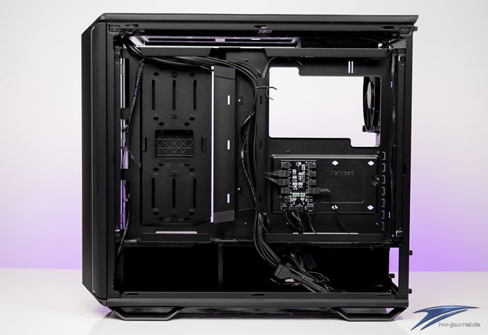 Selbst wenn man Lüfter verbaut hat, ist im Bereich hinunter zum Mainboard, noch genügend Platz vorhanden. Insgesamt betrachtet bietet der Innenraum sehr viel Gestaltungsmöglichkeiten für eine All-in-one-Lösung oder aber auch für Custom-Loops, die hier ebenfalls viel Entfaltungsspielraum geboten bekommen.
