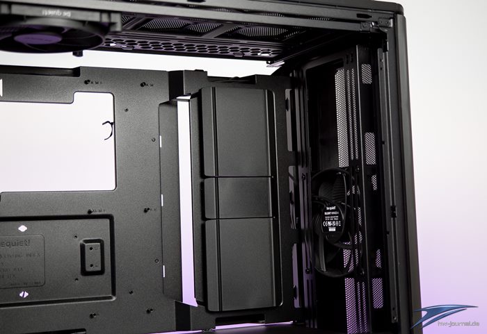 Apropos Bracket, wie u. a. schon bei der neuen Light Base Generation (zum Test) gesehen, hat auch das Dark Base 701 eine herausnehmbare Halterung für den Top-Bereich. Hier lassen sich komfortabel Wärmetauscher oder Lüfter extern montieren und als Ganzes dann ins Chassis einschieben. Die darüber befindliche Abdeckung lässt sich ebenfalls ganz einfach abnehmen, sodass der Zugriff auf den Innenraum vollkommen frei liegt.