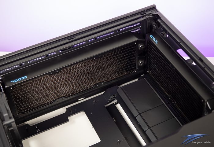 Das Thema Wasserkühlung wurde schon einmal angesprochen. Im Top und in der Front lassen sich bis zu 360 mm Wärmetauscher verbauen. Gerade im Deckel kommt hier das herausnehmbare Bracket wunderbar zur Geltung, da man seinen Radiator mitsamt Lüfter wunderbar und bequem dann extern verbauen kann.
