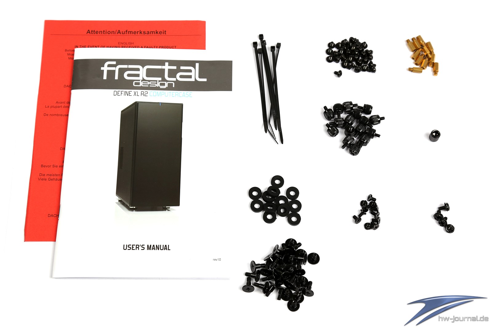 Der Lieferumfang beinhaltet natürlich zuerst einmal das Gehäuse selbst. Dazu kommen noch ab Werk montierte Lüfter von Fractal Design in 140-Millimeter Ausführung. Des Weiteren zählen Schrauben für das komplette Gehäuse, ein Satz Kabelbinder, Gummis zur Entkopplung der Datenträger sowie eine bebilderte mehrsprachige Anleitungen zum Lieferumfang.