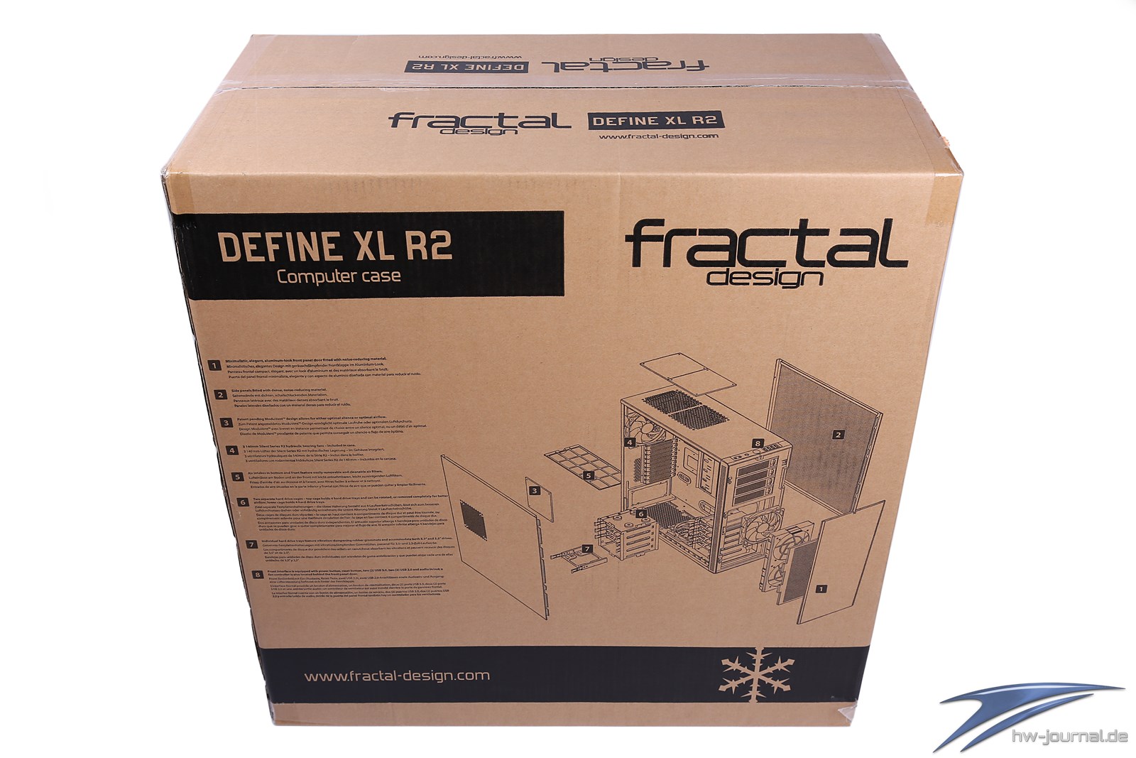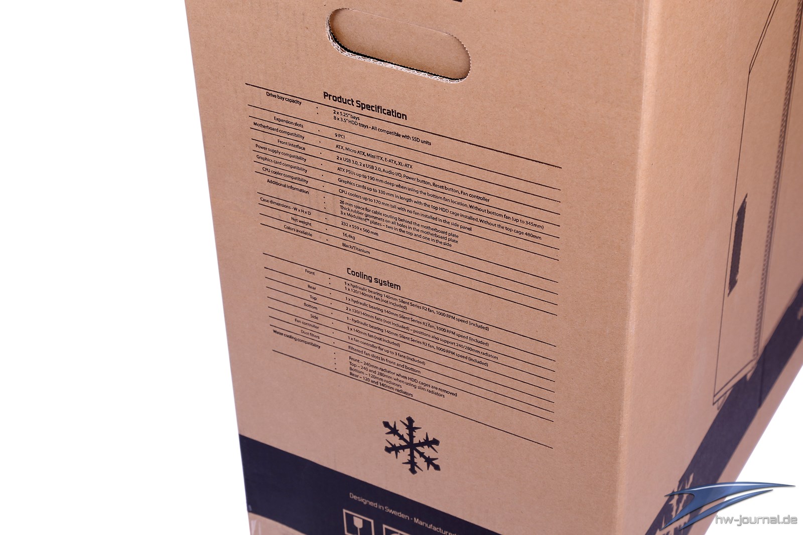 Fractal Design liefert das in einer in einer Kartonfarbenen, mit den technischen Daten, Bildern des Gehäuses und Features bedruckten Kartonschachtel an den Kunden aus. Im Inneren wird das Gehäuse von zwei stabilen Styroporelementen geschützt und gehalten. Damit bietet die Verpackung einen guten und sicheren Transportschutz.