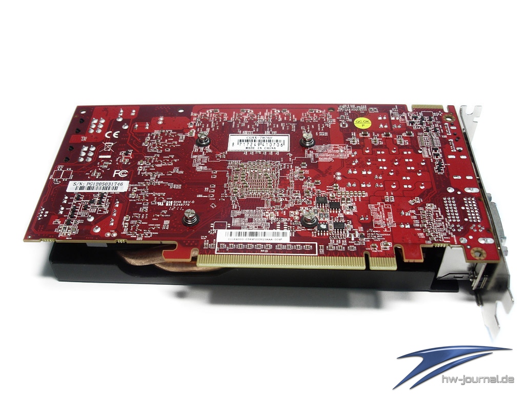 Auf der Rückseite findet sich nichts Außergewöhnliches – fast schon ungewohnt, in Zeiten von High-End Kühlereigenkreationen, ein wenig verbautes PCB anzutreffen. An der Backpanel-Blende findet sich dann die Fülle der digitalen Anschlüsse wieder. Insgesamt 2x DVI, 1 HDMI und 2x Display-Ports stehen dem Anwender für externe Bildwiedergabegeräte zur Verfügung. Ebenfalls und logischer Weise auch vorhanden, ist der CrossFire Verbindungsport.