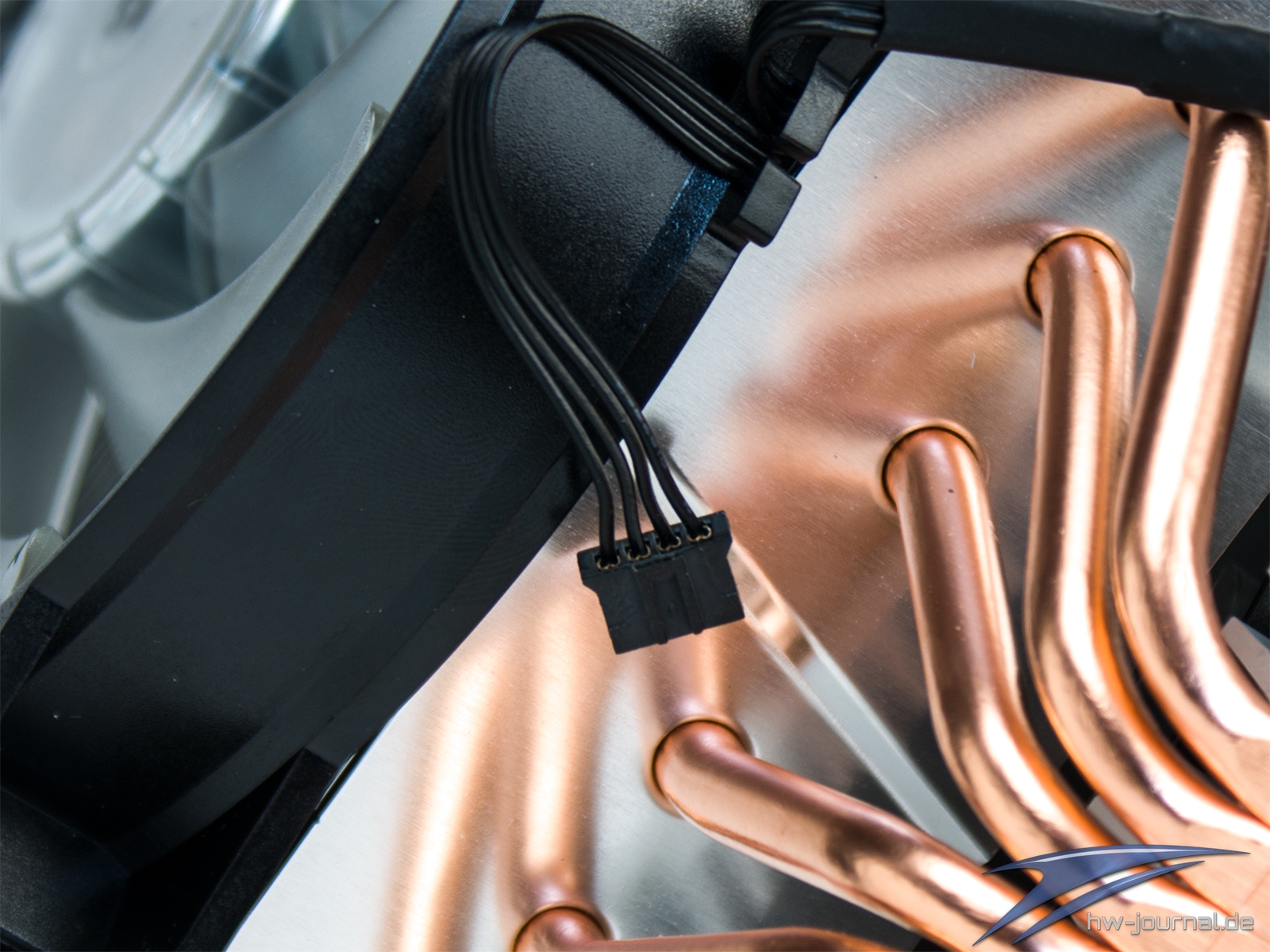 Die Befestigung der Lüfter erfolgt über Klammern. Diese sind im Vergleich mit anderen Modellen relativ stark und robust ausgelegt. Durch die exakte Fertigung halten sie die Lüfter sehr fest an Ort und Stelle, obwohl sie nicht sehr weit in die Bohrungen reichen. Gut gefällt uns auch, dass sie schwarz beschichtet wurden.
