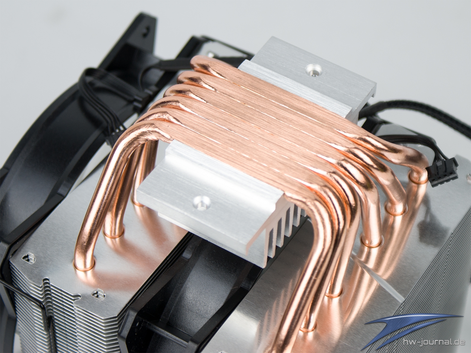 Ein Blick auf die Unterseite zeigt ein bekanntes Bild. Auch hier kommt die CDC 2.0 Technologie zum Einsatz. Die Führung der Heatpipes unterscheidet sich hingegen, bauartbedingt, deutlich von der des MA610P. Die sechs 6mm Heatpipes verlaufen hier symmetrisch von Turm zu Turm und bilden eng aneinandergepresst die Bodenplatte.