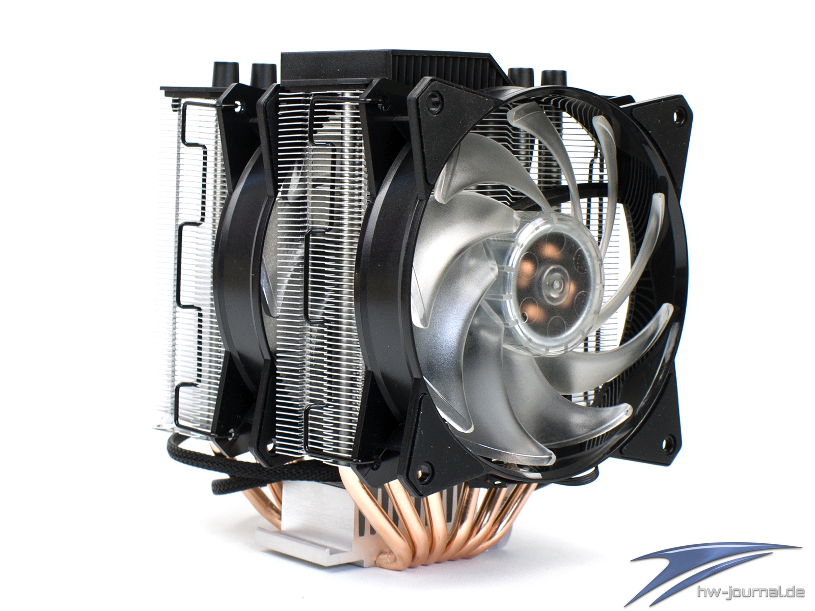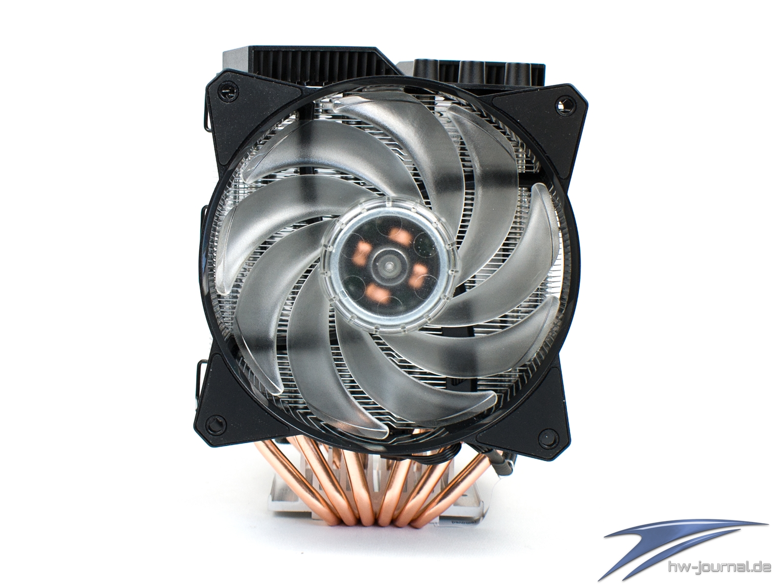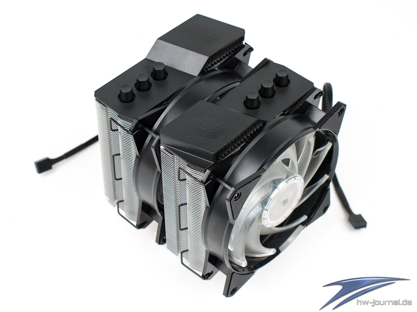Hingegen gleich geblieben ist die Farbgebung. Auch beim MA620P wird schwarzes Kunststoff als Design-Element verwendet. Die Beiden Tops verbergen die Heatpipe-Enden und sind gerne willkommen. Die geschlitzten Tunnel in den Tops haben dabei eher keine technische, als nur eine optische Funktion. Auch die Rahmen der Lüfter sind schwarz und ergeben ein stimmiges Bild. Sie erinnern mit der Form und den Gummi-Entkopplern dabei stark an die Lüfte der MasterLiquid 240, nur dass der Rotor hier heller ist. Dies kommt der integrierten Beleuchtung zugute und lässt das Licht besser streuen.