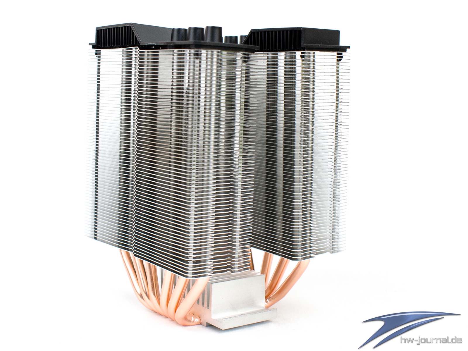 Nackt erkennt man, dass der Kühler an sich sehr schlicht und einfach gehalten ist. Ohne die Tops würde eine klassische Gestalt abgeben, was auch daran liegt, dass man die Heatpipes nicht beschichtet. Da man von diesen im eingebauten Zustand nichts sieht, ist der Verzicht verschmerzbar.