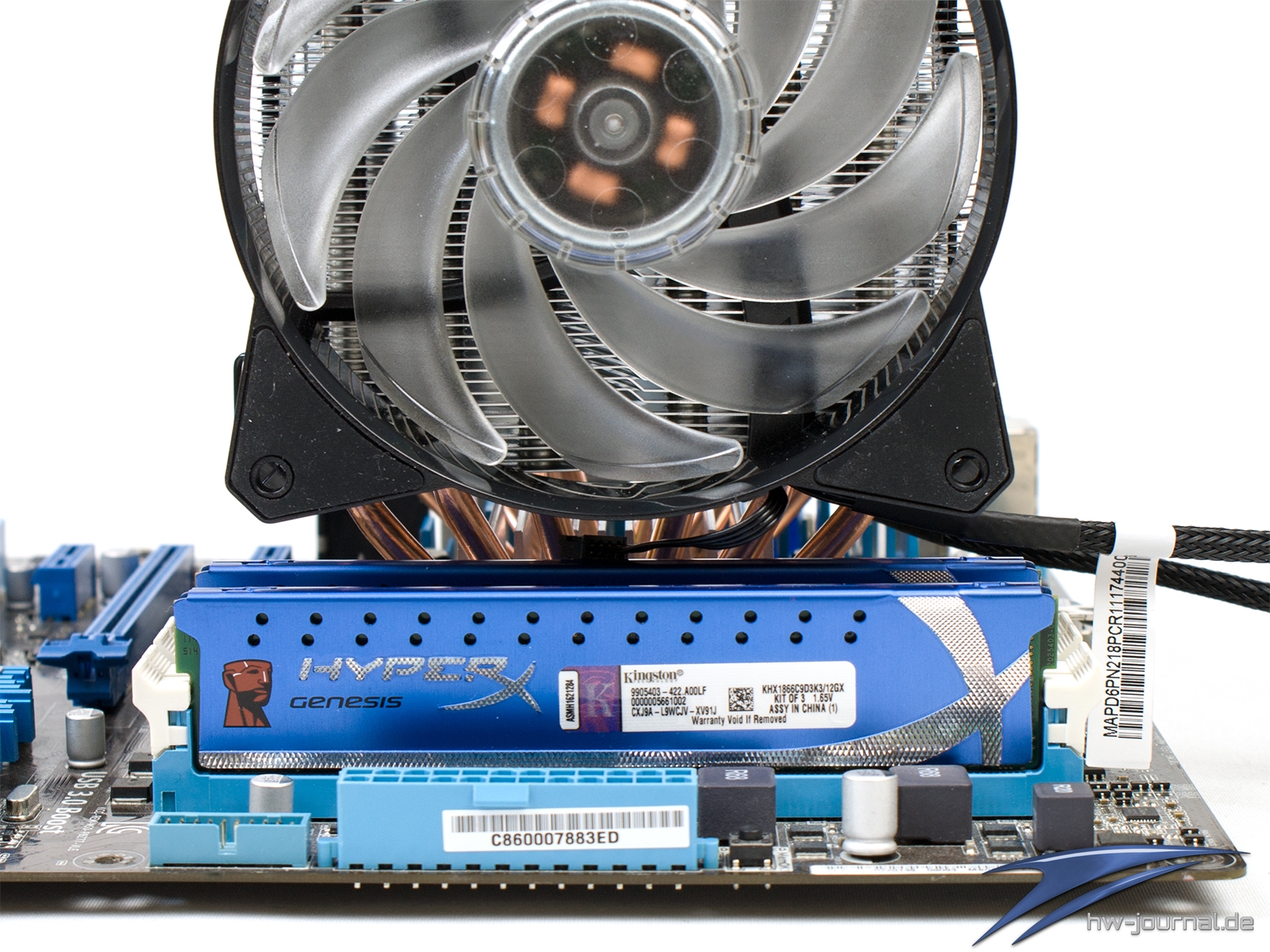 Wie man zuvor bereits sehen konnte, ragt der vordere Lüfter bis über den dritten RAM-Slot. Hier ist man also noch mehr auf flachen Arbeitsspeicher angewiesen. Low-Profile Heatspreader haben nach oben aber noch etwas Luft. Beim PCIe Slots verhält es sich ungefähr so wie beim MA610P. Auch hier wird es also eng, aber eine Behrührung sollte es dennoch nicht geben.