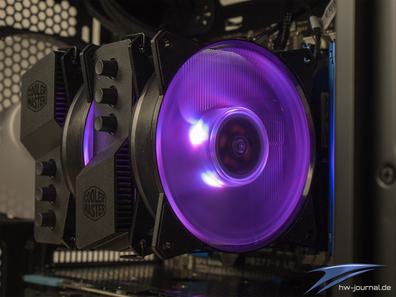 Den MA620P haben wir nur im Testsystem verbaut. Da weder Mainboard noch Gehäuse über einen RGB Controller verfügen, musste hier zwangsläufig der beiliegende Controller genutzt werden. Wie man sieht, erfüllt er seinen Zweck sehr gut.