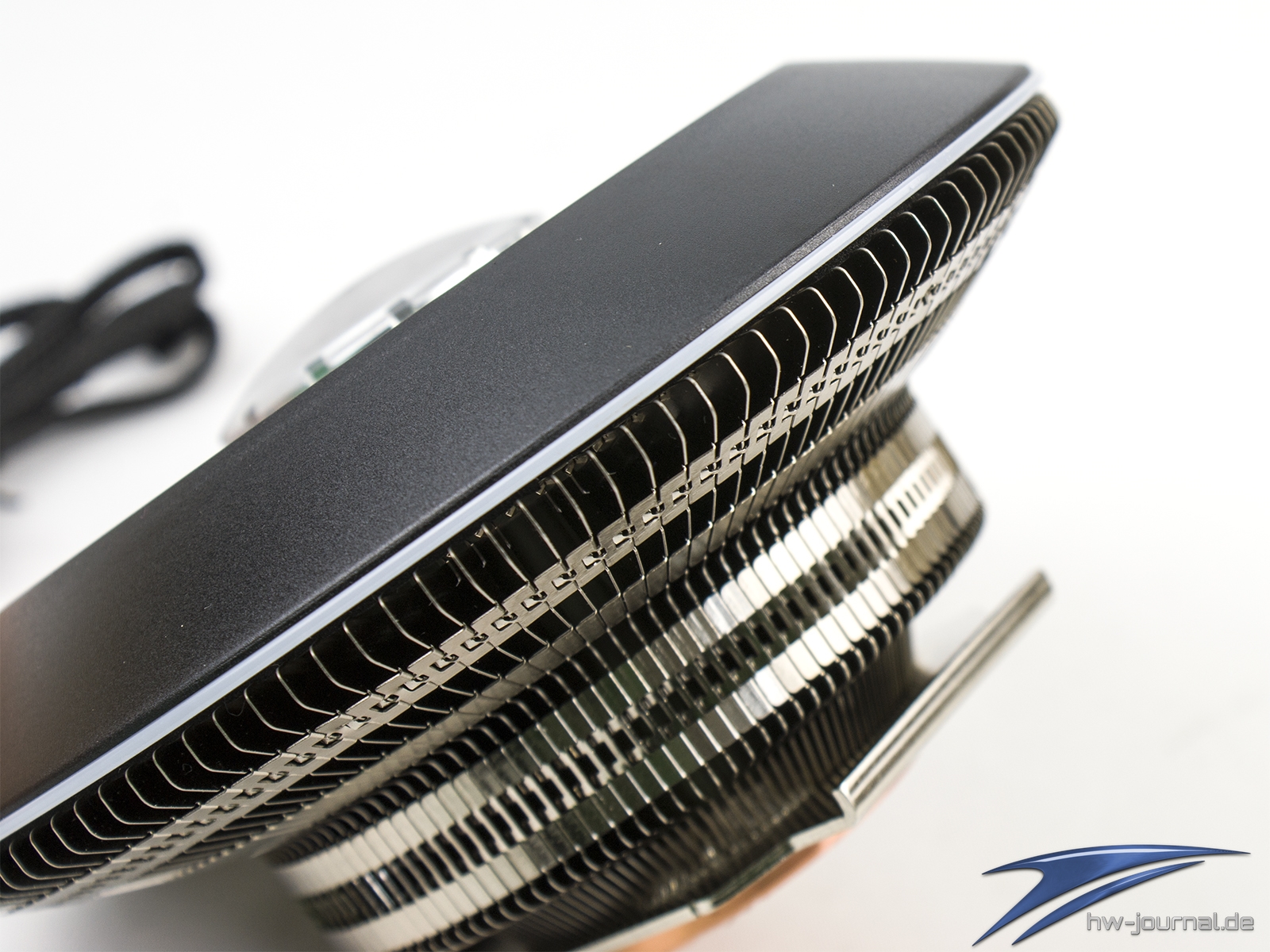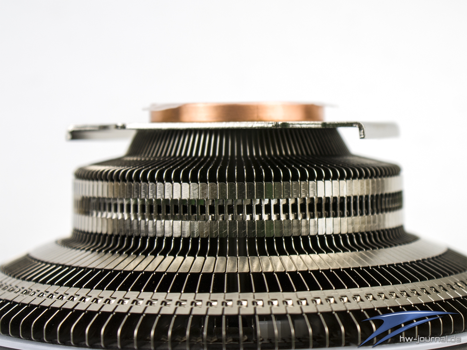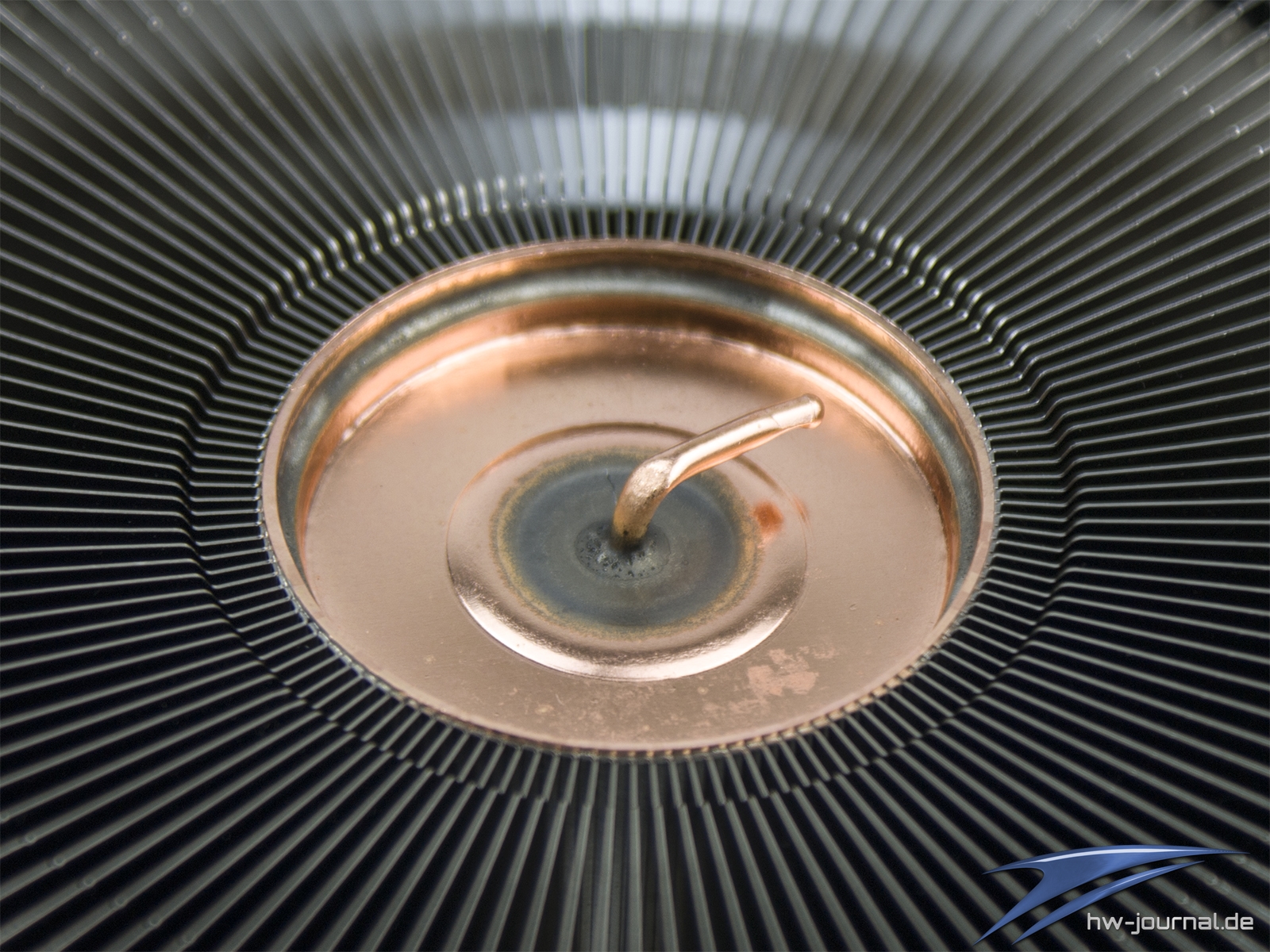 Nimmt man den Lüfter vom Kühler, so bekommt man den freien Blick auf die Finnen und das Top der Säule. Der krumme Docht wirkt hier etwas merkwürdig. Er dient vermutlich der Füllung und Verschließung der Röhre. Denn ein Zusammendrücken, wie es sonst so oft bei Heatpipes angewendet wird, wäre hier einfach nicht möglich.