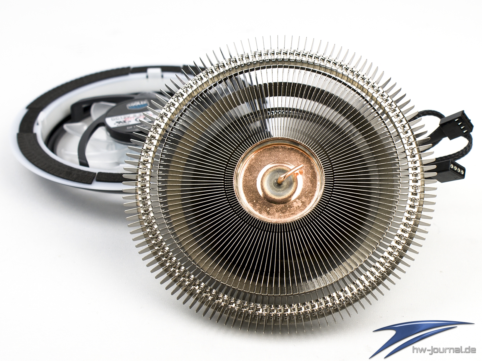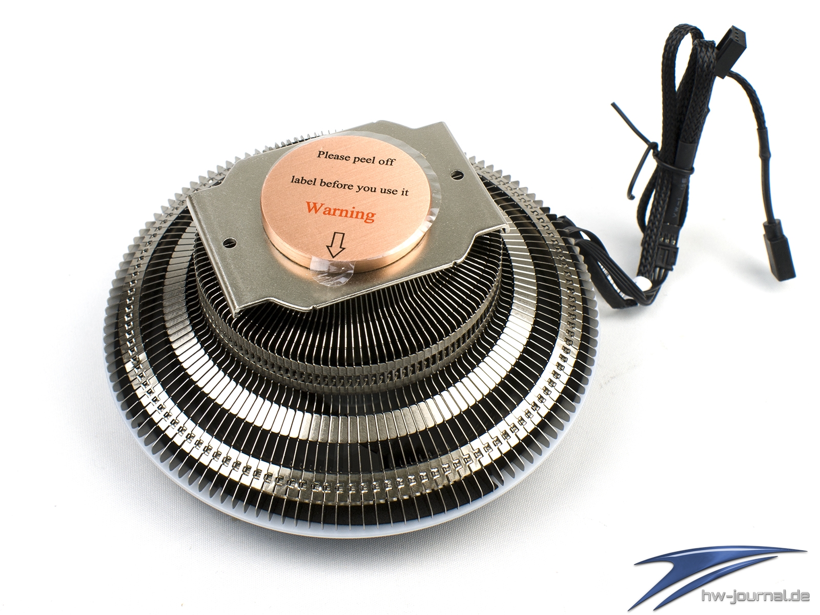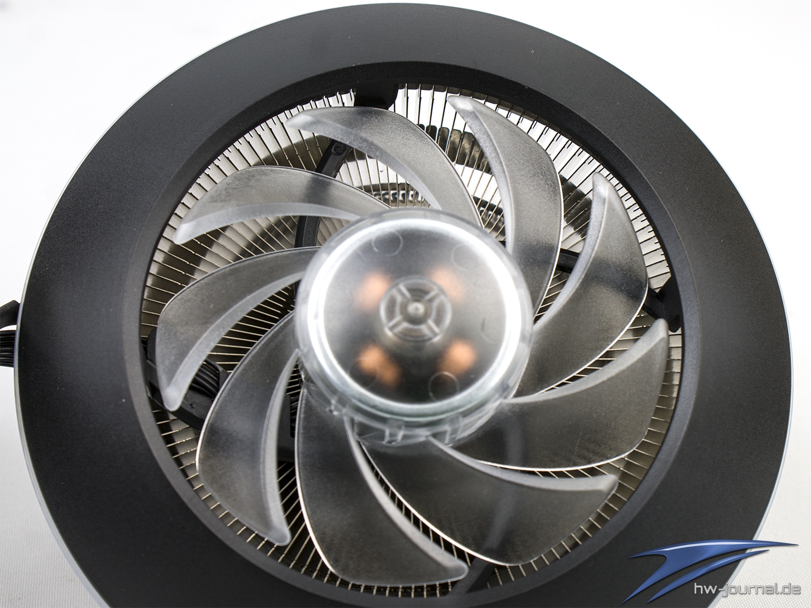 Nimmt man den Lüfter vom Kühler, so bekommt man den freien Blick auf die Finnen und das Top der Säule. Der krumme Docht wirkt hier etwas merkwürdig. Er dient vermutlich der Füllung und Verschließung der Röhre. Denn ein Zusammendrücken, wie es sonst so oft bei Heatpipes angewendet wird, wäre hier einfach nicht möglich.