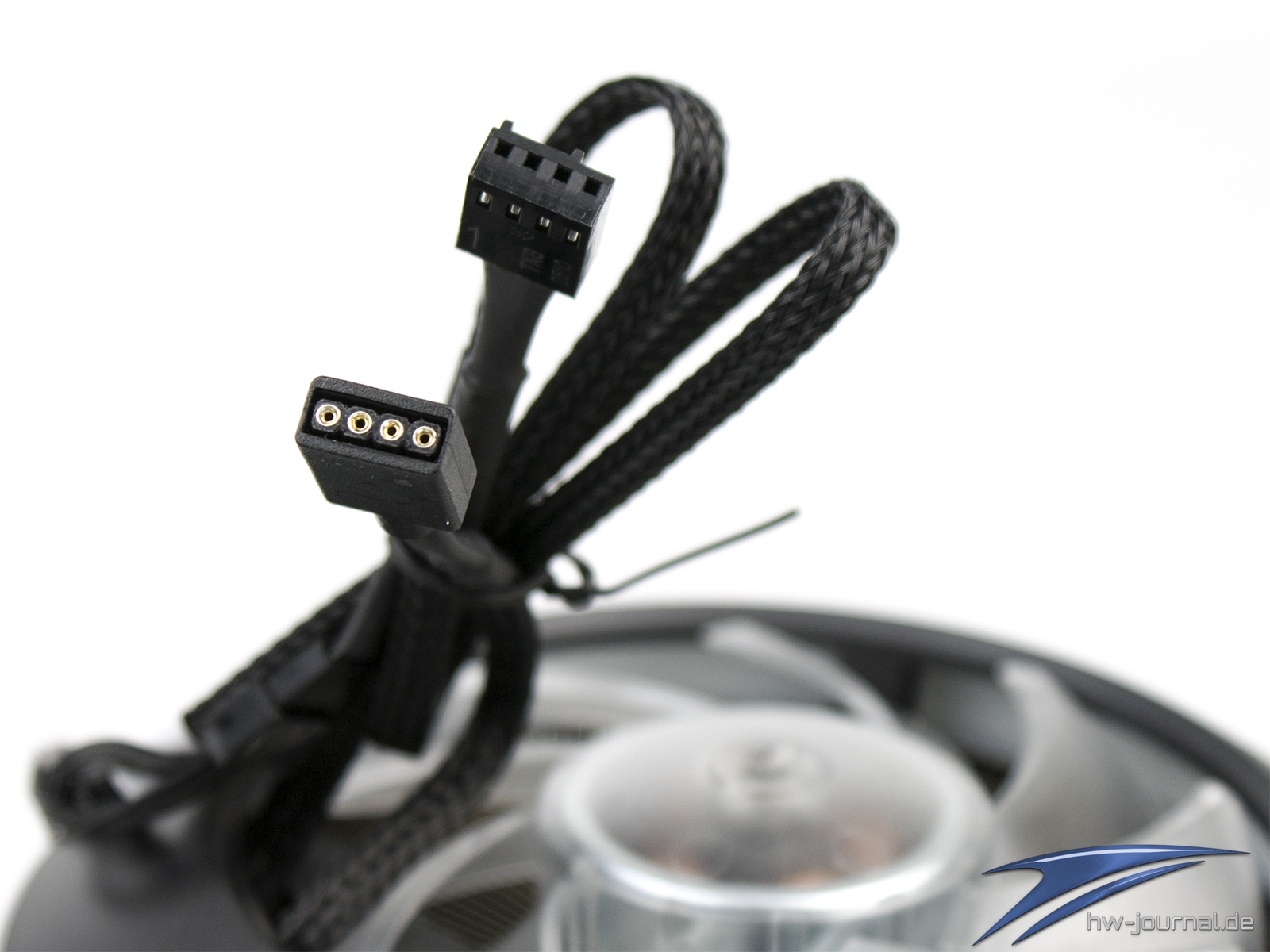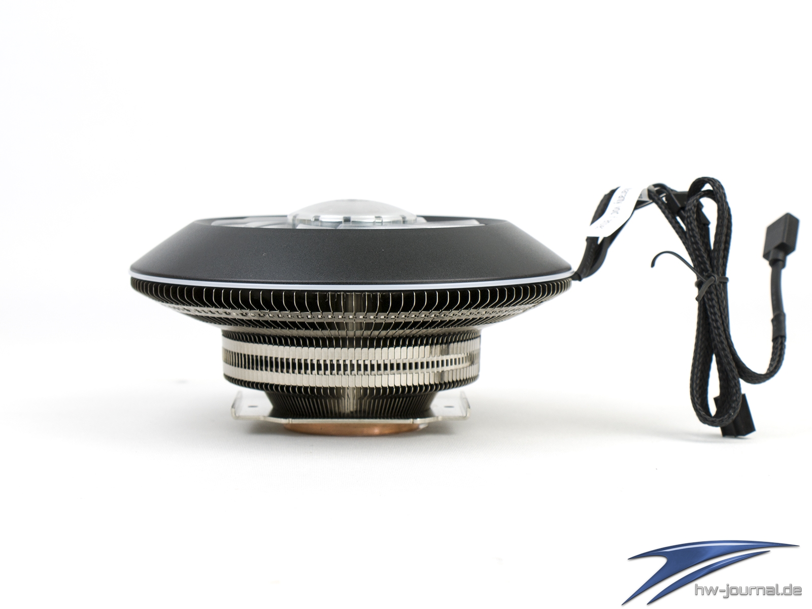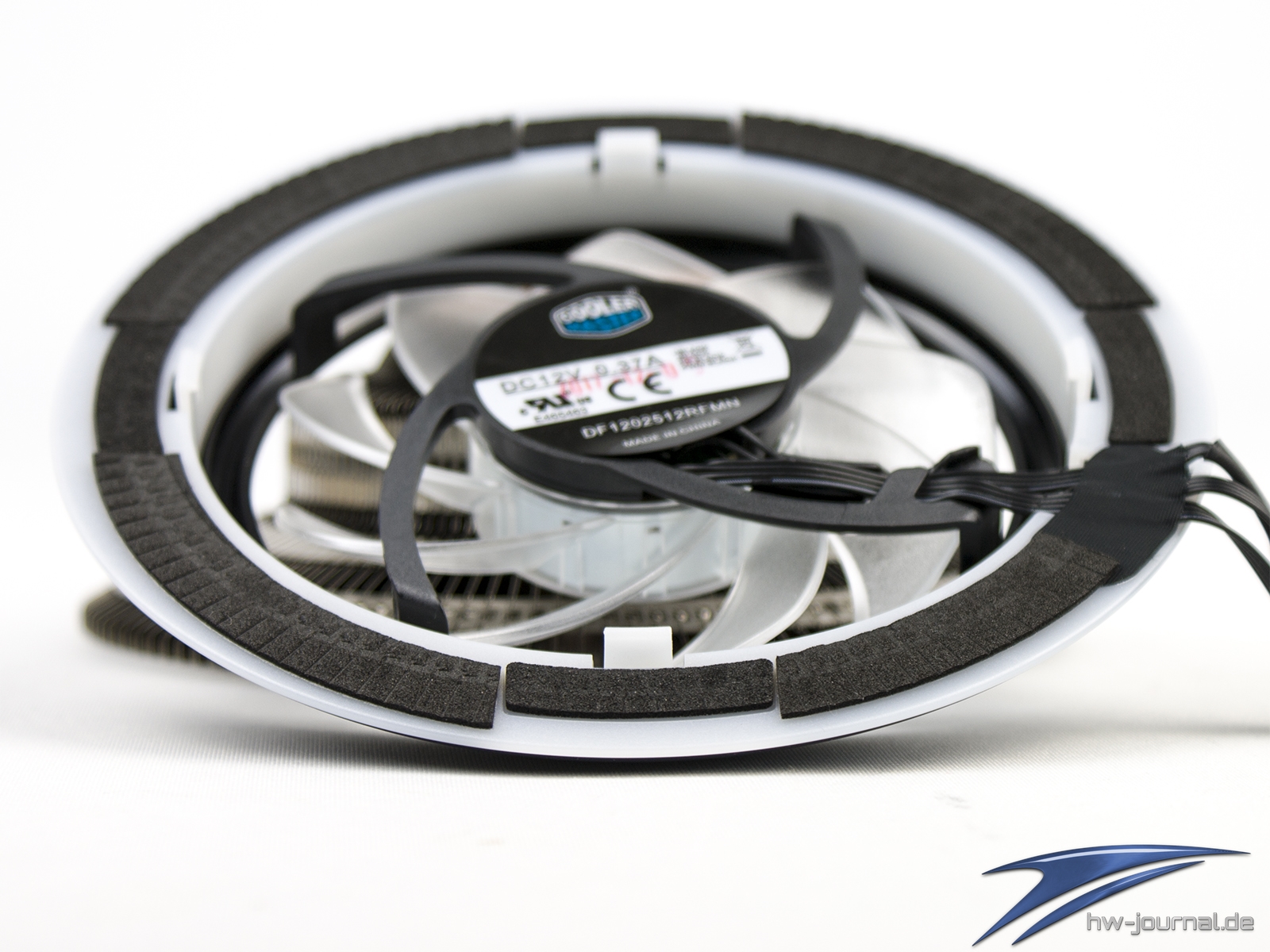 Der Lüfter samt Rahmen ist auf den Kühler mit vier Kunststoff-Klipsen einfach aufgesteckt. Der Halt ist zufriedenstellend und bedarf keiner Verbesserung. Damit keine Schwingungen des Lüfters auf den Kühler übertragen wird, sind großflächig Moosgummi-Streifen aufgeklebt. Das Typenschild gibt keine genaure Auskunft darüber, ob es sich um einen anderen, adaptierten Lüfter handelt. Witzigerweise gibt der Hersteller die Belegung der Kabel an, jedoch sind diese alle Schwarz und daher optisch nicht zu unterscheiden. Insgesamt führen wieder zwei Kabelstränge aus dem Kühler. Einmal vierpolig für die PWM-Steuerung des Motors und einmal vierpolig für die 5050-RGB-LEDs. Dieser Stecker ist nun mittlerweile weit verbreitet, sodass man die Beleuchtung auch mit sehr vielen Mainboards anpassen könnte.