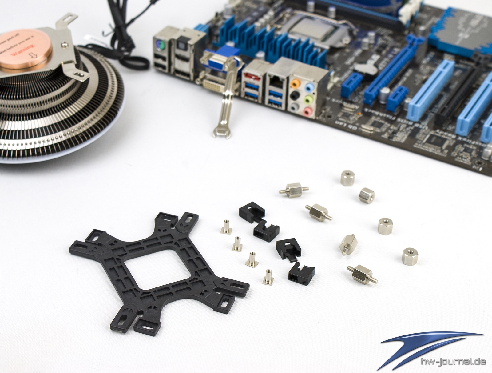 Für den Sockel 1150 braucht man fast alles, was die Tüte hergibt. Bis auf die Brücken sowie die speziellen schwarzen Kunststoff-Klipse, ist das Material dabei identisch zur AMD Sockel Befestigung. Das folgende Bild zeigt in welcher Reihenfolge man die Komponenten benötigt.