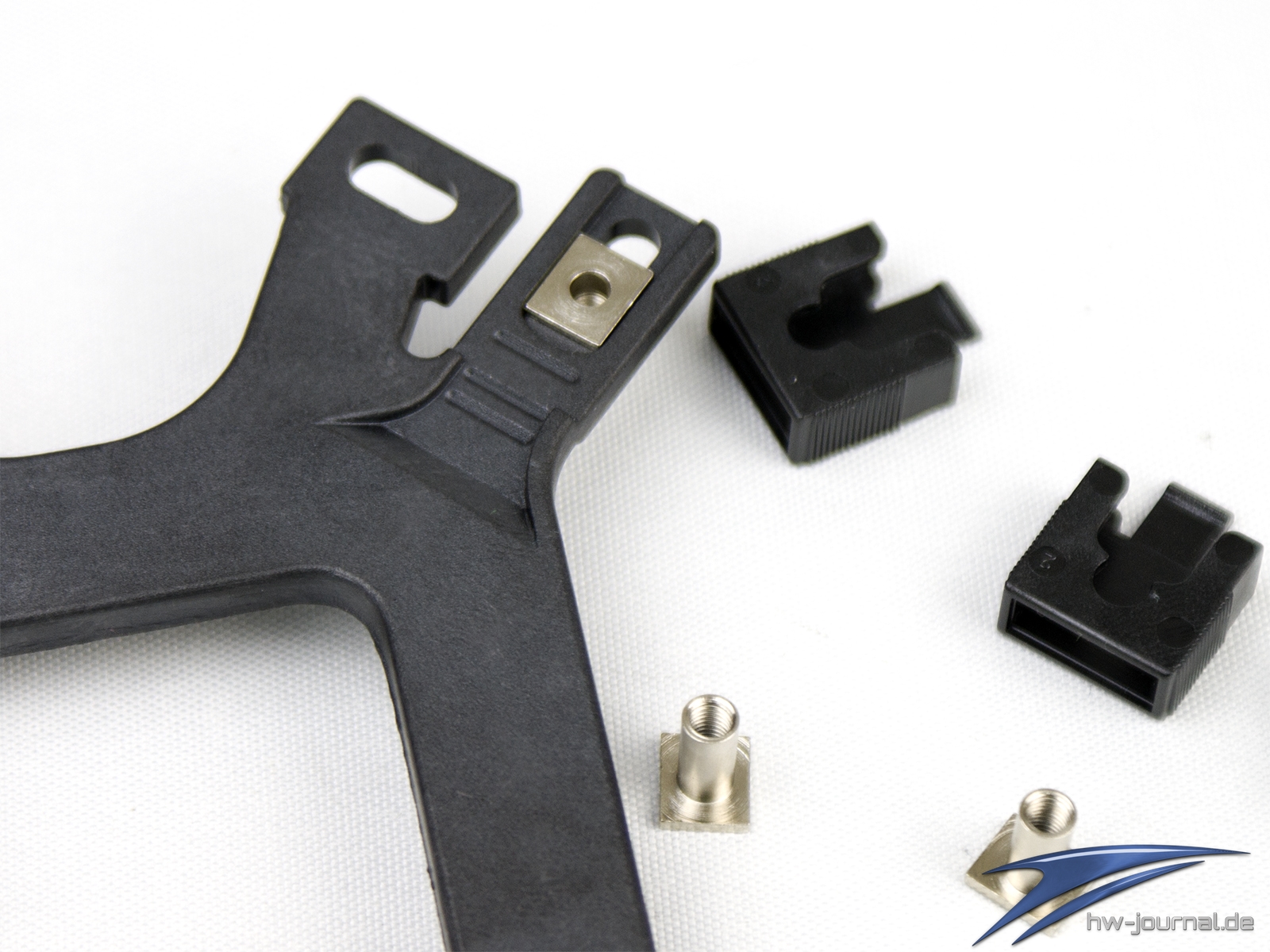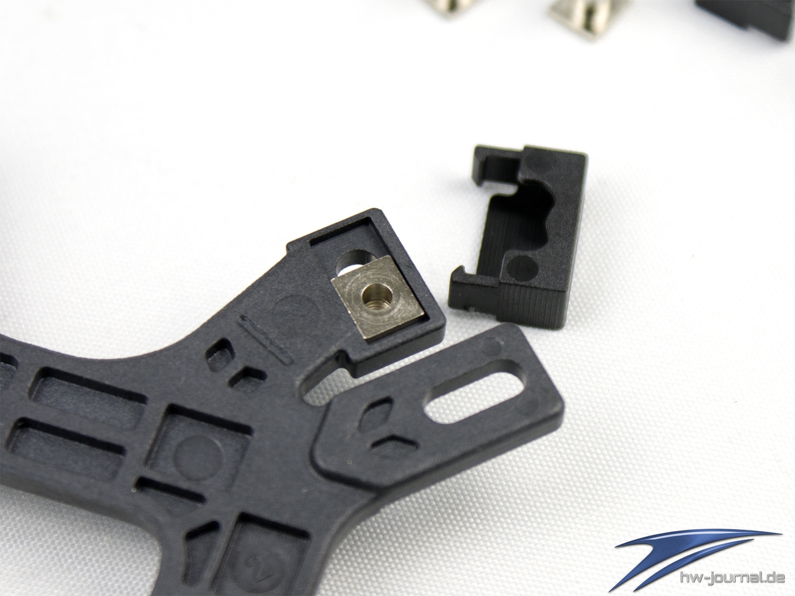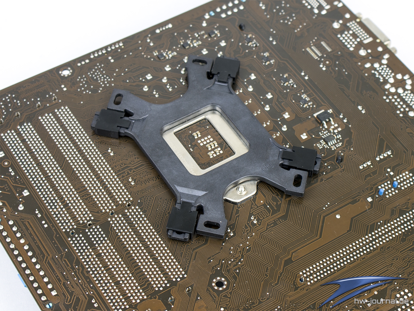 Zunächst bereitet man die Backplate passend zu. Dafür werden die Metalgewinde in die Intel-Öffnung eingeführt. Fixiert werden diese mit den schwarzen Kunststoff-Klammern, welche man von außen einfach über den Steg und um die Hülse führt. Die Rastnasen auf Plate geben die richtige Stellung in den Langlöchern an. Die Mitte ist für Sockel 115X die richtige Position. Hat man dies für alle Ecken erledigt, kann man die Backplate bereits auflegen.
