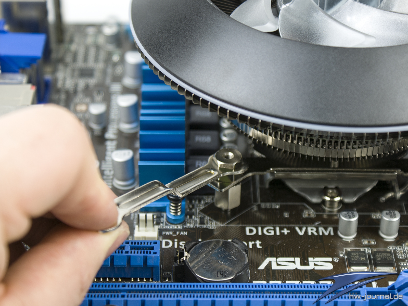 Hat man den Kühler auf das Board bzw. die CPU gesetzt, schraubt man die Muttern auf. Natürlich erst wieder von Hand vordrehen und danach kreuzweise mit dem Schlüssel.
