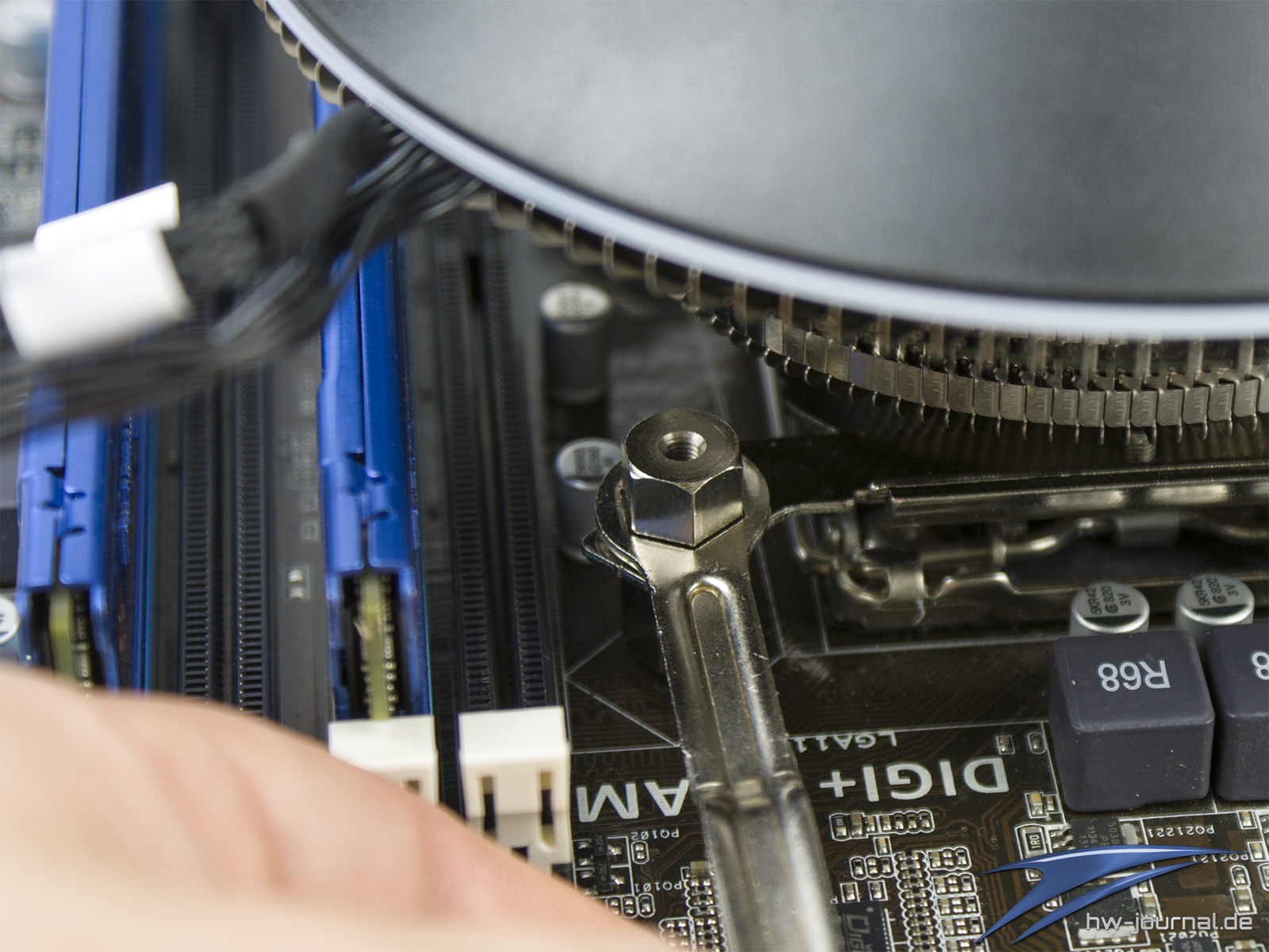 Nun geht es am Mainboard weiter. Die Backplate wird mit den Schrauben fixiert, wobei hier dann immer noch etwas Spiel bleibt. Nun kann man den Kühler auflegen und die Muttern leicht vorschrauben. Danach geht es an das kreuzweise Festziehen mittels des Ringschlüssels. Hier wird der Montage-Prozess zum ersten mal etwas umständlich. Für uns ist dieser Schritt auch dafür ausschlaggebend zu sagen, dass man den Kühler bei ausgebautem Mainboard durchführen sollte bzw. es eigentlich nicht anders möglich ist. Unser Mainboard ist an der oberen Seite dabei nicht mit einem Kühler versehen. Sollte man hier auch noch einen antreffen, so muss zwangsläufig der RAM entfernt werden, was aber auch ein Problem darstellen kann. Denn diesen kann man nur ganz kanpp einstecken, wenn der Kühler sitzt, jedoch auch nur dann, wenn es sich um Low-Profile Speicher handelt.