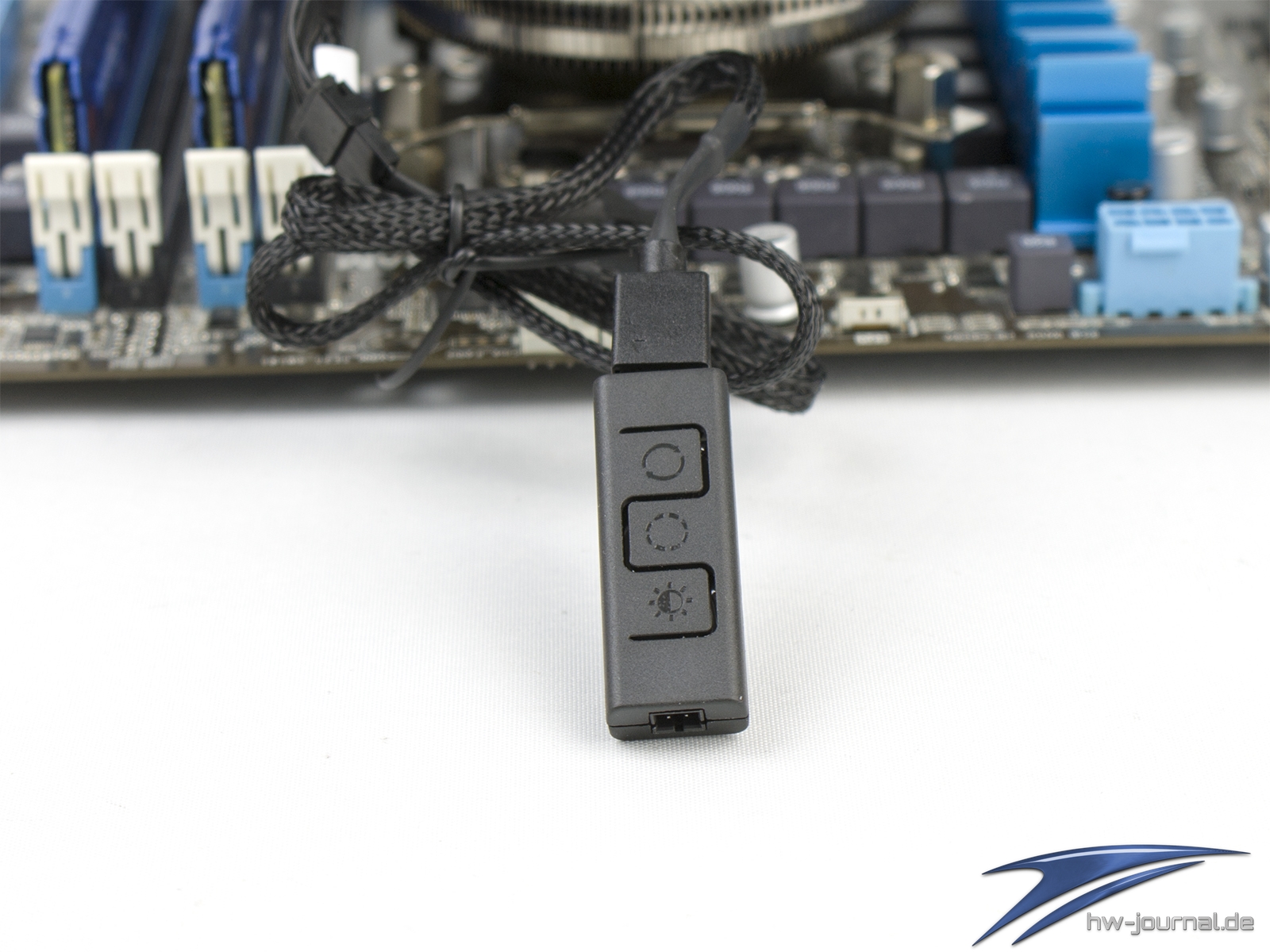 In unserem Testsystem verwenden wir zudem den beiliegenden In-Line-RGB-Controller, da das Board den passenden Header nicht bereitstellt. Von oben nach unten wählt man den Effekt-Modus, die Farbe und die helligkeit per Knopfdruck. Der unten ersichtliche Stecker wird zur Stromzufuhr genutzt. Hierfür wird ein freier Molex-Stecker vom Netzteil benötigt.