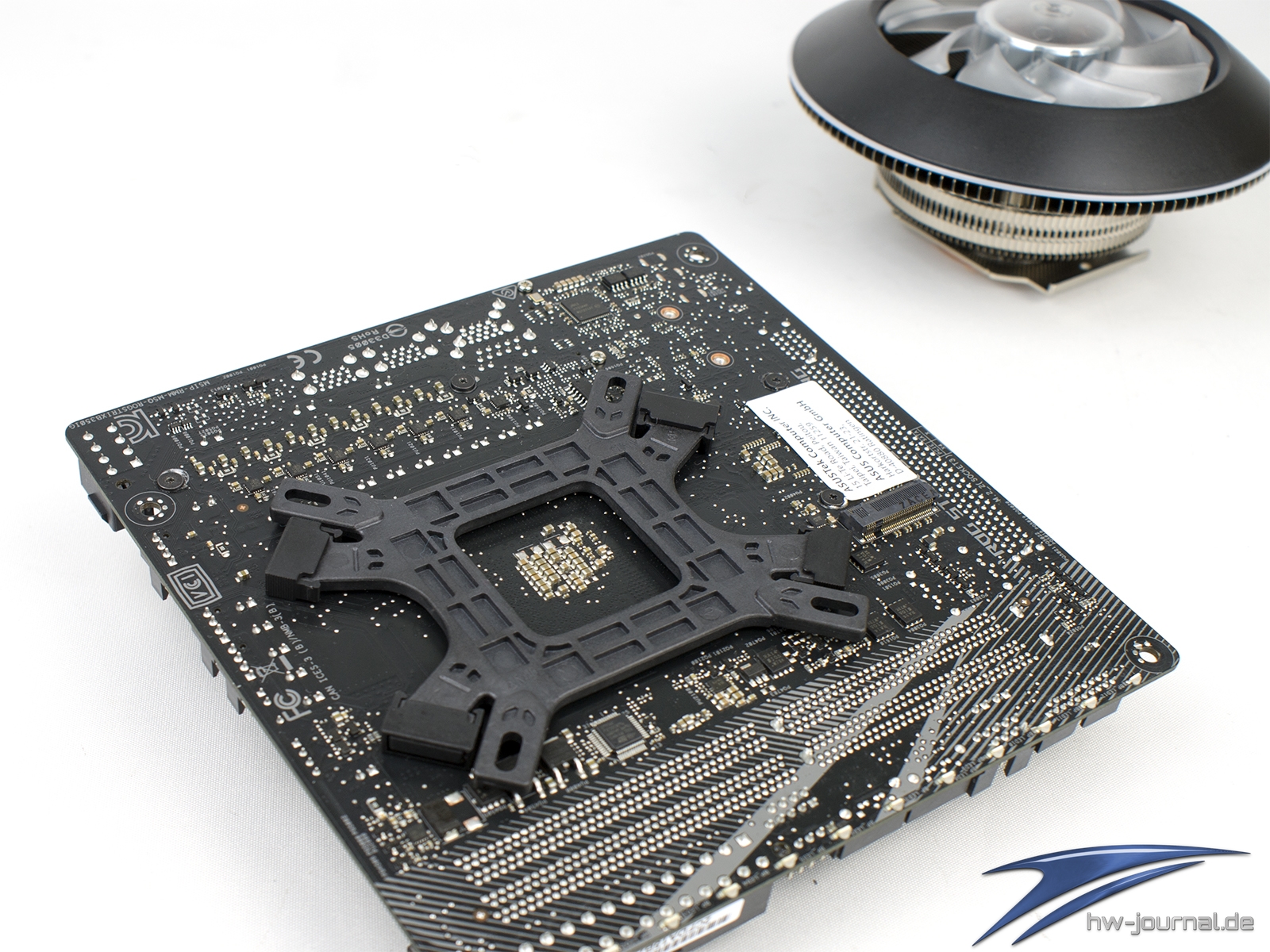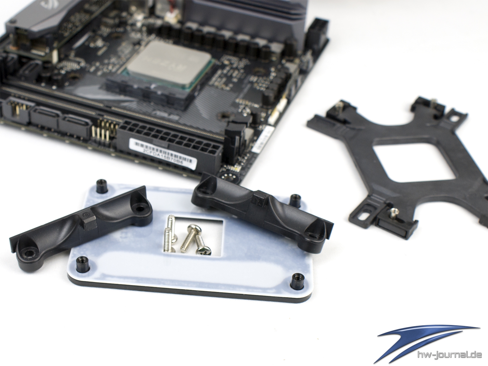 Unterschiede im Vorgehen der Montage liegen eigentlich nur in der Auswahl der Kunststoff-Klipse und der Befestigung der Gewindebolzen in der Backplate. Wie man sieht, muss man die mittigere Position wählen, wobei man für den Sockel AM4 den Bolzen im Langloch nach außen setzten muss. Im nächsten Schritt gilt es die original Backplate zu entfernen und kann dann schon die vorbereitete aufsetzten.