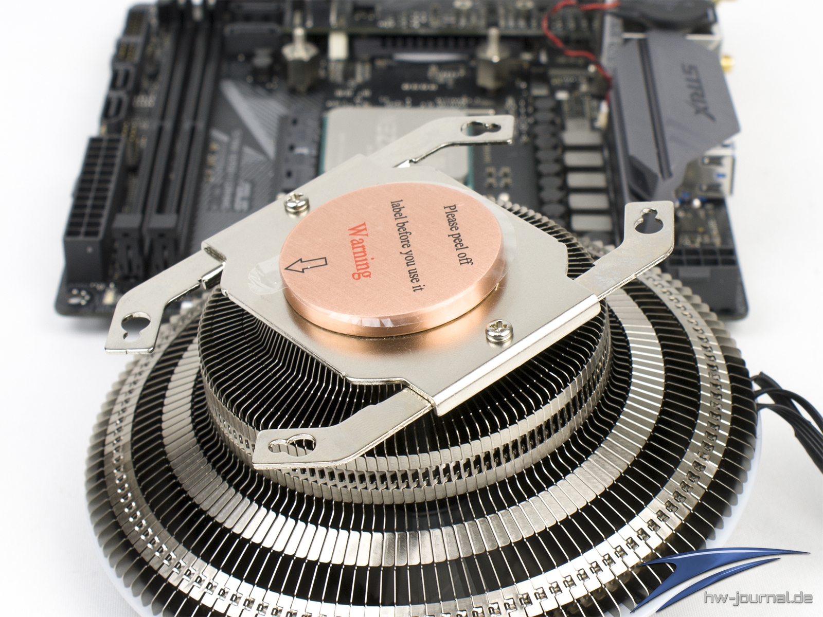 Die Finnen sind kreisförmig um die Säule gestaffelt und durch Hacken miteinander verbunden. Kurz oberhalb der Bodenplatte bzw. der Montageaufnahme wird der Durchmesser der Finnen auf etwa 90mm aufgeweitet, um dann auseinanderzulaufen. Dieser Stufenbauweise ist es zu verdanken, dass der Kühler trotz der 74,5mm Höhe immer noch Platz für den RAM lässt, obwohl dieser überragt wird. Dass hier aber Grenzen gesetzt sind, zeigt sich auf der folgenden Seite. Die Aufnahme der Montage-Kits sitzt sozusagen auf einem Kranz der Säule und baut damit einen hohen Druck auf die CPU aus, so zumindest das subjektive Empfinden.