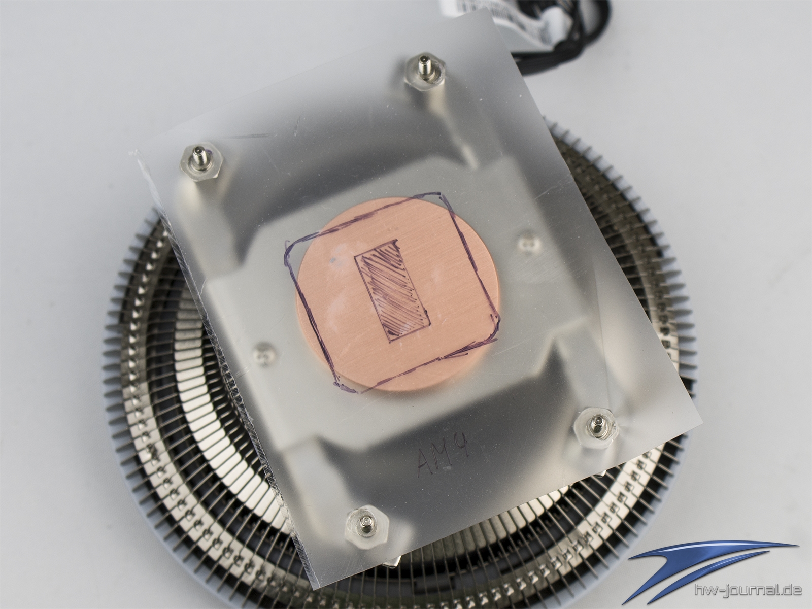 Um aufzuzeigen inwieweit der Durchmesser der Wärmeröhre für aktuelle Prozessoren ausreicht, haben wir wieder die Folien-Methode angewendet. Wie man sie, werden Intel Mainstream-CPUs (S.115X) komplett abgedeckt, während die CPUs der HEDT Plattform (hier S.2066) an den Ekcen etwas über den Durchmesser herausragen. Gleiches gilt auch für die AMD AM4 CPUs. Im Fall der Ryzen CPUs braucht man jedoch nichts befürchten, da der Zeppelin-Die wie angedeutet komplett unter der Bodenfläche verschwindet.