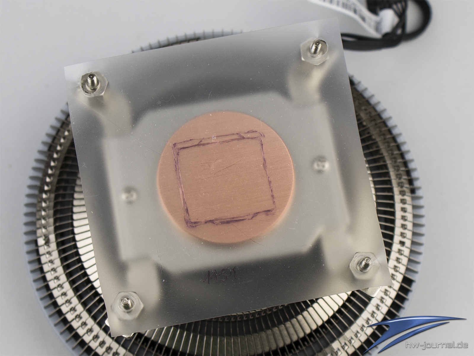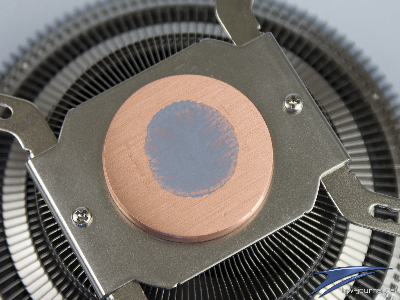 Bei der Montage hat Cooler Master auf die gleiche Backplate wie beim MA610P und MA620P, jedoch ist das weitere Zubehör verschieden. Insgesamt wird die backplate dabei für alle Sockel bis auf die Intel Sockel 2011, 2011-3 sowie 2066 verwendet. Wie man vorgeht, haben wir exemplarisch dokumentiert. Wichtig ist es jedoch in allen Fällen, dass man die Wärmeleitpaste gleichmäßig auf dem Boden oder IHS verteilt. Die Klecks-Methode scheint nicht wirklich zu funktionieren, da die raue Bodenplatte ein automatisches Verteilen durch den Anpressdruck verhindert. Wir haben die Paste daher nach dem ersten Anpressdruck-Test erneut gleichmäßig verteilt, damit sich nicht folgendes Bild ergibt.
