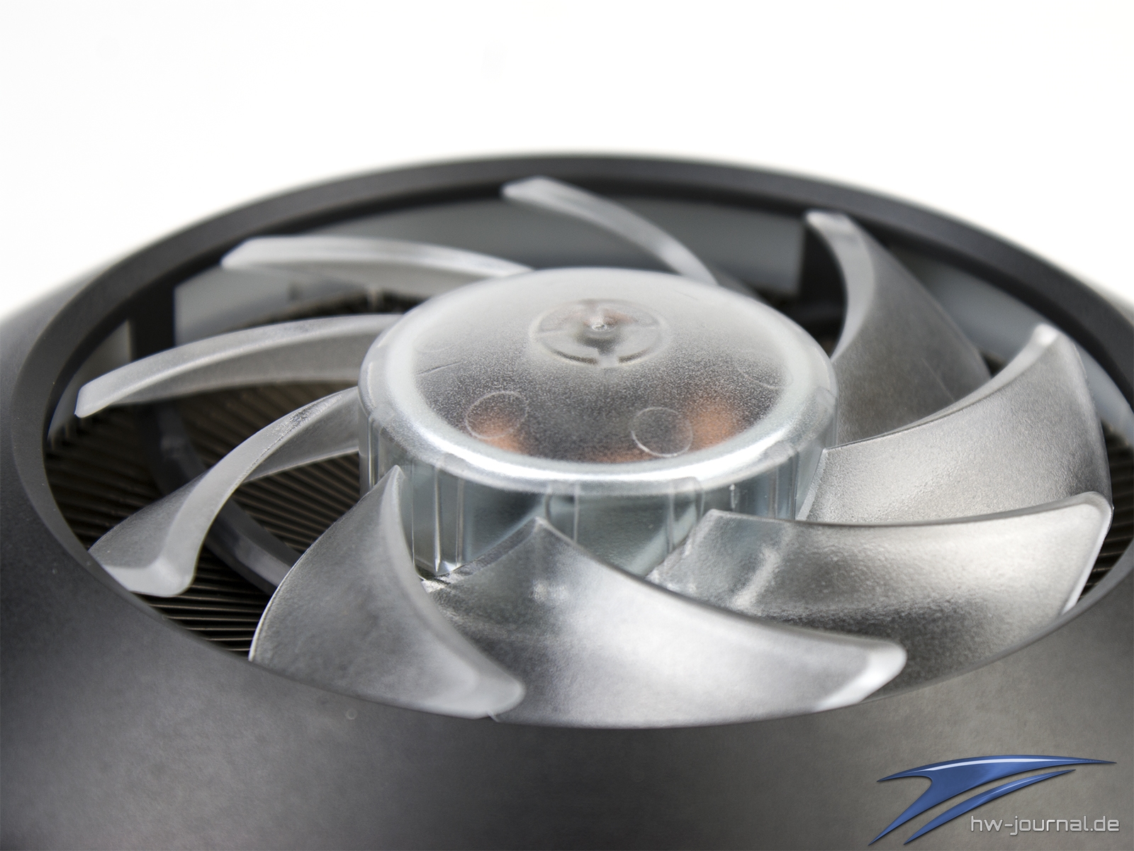 Die Verarbeitung des Lüfterkonstrukts wirkt dabei insgesamt wie aus einem Guss, da keine Schrauben sichtbar sind. Mängel am Kunststoff-Rahmen oder dem Lüfter konnten wir nicht ausmachen. Die Übergänge sind wirklich fließend, was trotz der großflächigen Nutzung des günstigen Materials, für ein wertiges Gefühl sorgt. Der Rotor des 100mm Lüfters ist ähnlich Beschaffen, wie der Hersteller es auch bei den anderen RGB-Lüftern umsetzt: Transparent mit rauer Oberfläche damit das Licht gestreut wird. Die Dioden der Beleuchtung des Rotors sitzen innerhalb der Nabe. Damit ist der Effekt des glühenden Motors (siehe z. B. MA610P) auch hier möglich. Beim Lüfter selber konnte man sich desweiteren auch bei keinem anderen Modell bedienen, wollte man aber scheinbar auch gar nicht, wie die runde Kappe der Nabe zeigt.