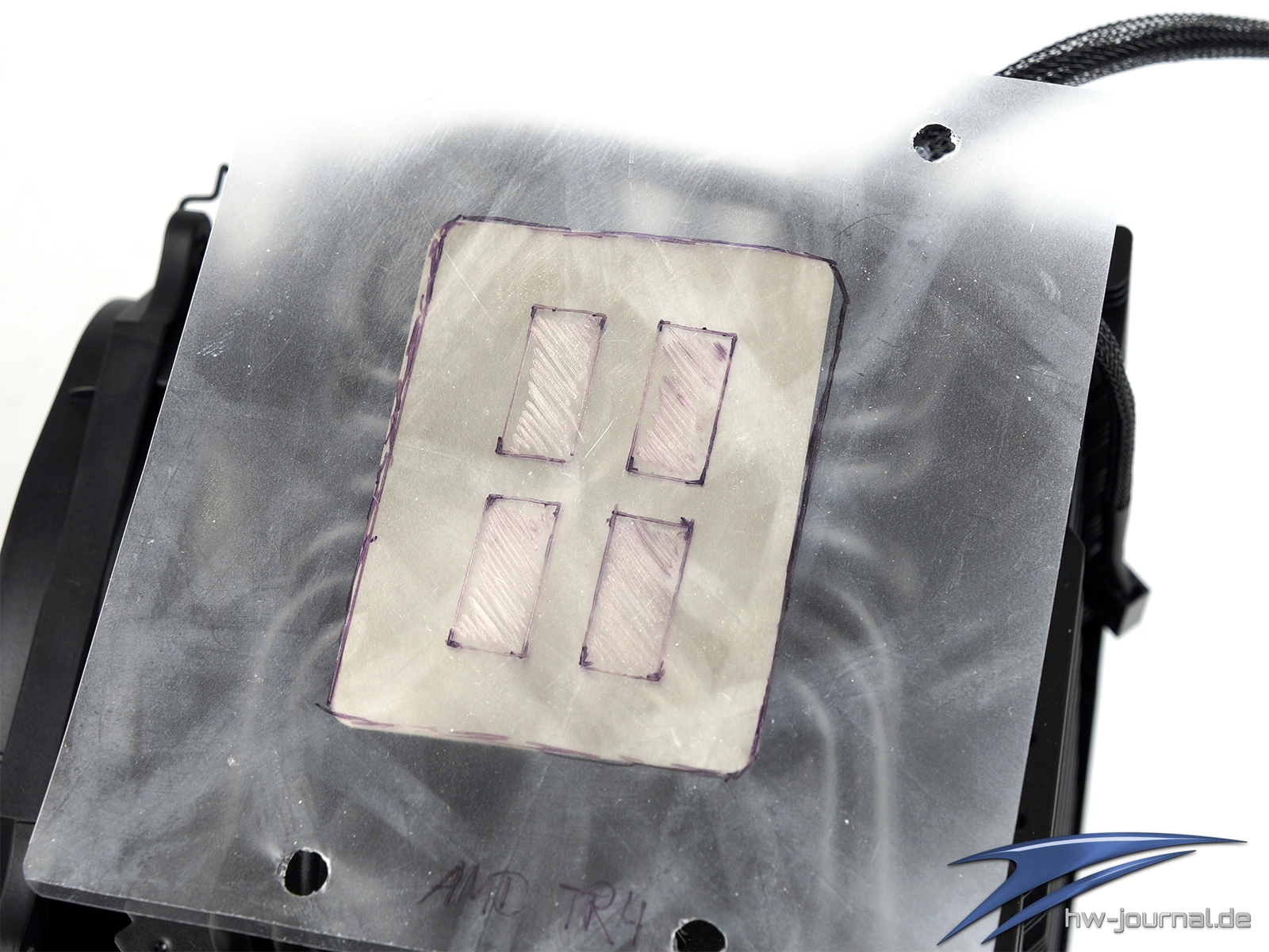 Bevor es an die Montage geht, noch einmal ein kurzer Blick auf den Kühlerboden. Die Vergrößerung der Bodenplatte wurde in der Form vorgenommen, dass der IHS der Threadripper CPUs komplett bzw. exakt abgedeckt werden. Wenn man genau hinschaut, dann erkennt man, dass sozusagen jeweils drei Heatpipes für zwei bzw. einen DIE zuständig sind. Die siebte Heatpipe verläuft dann zwischen den Kernen selbst entlang.