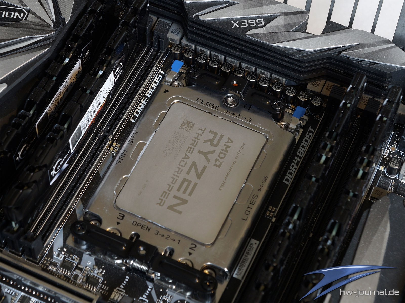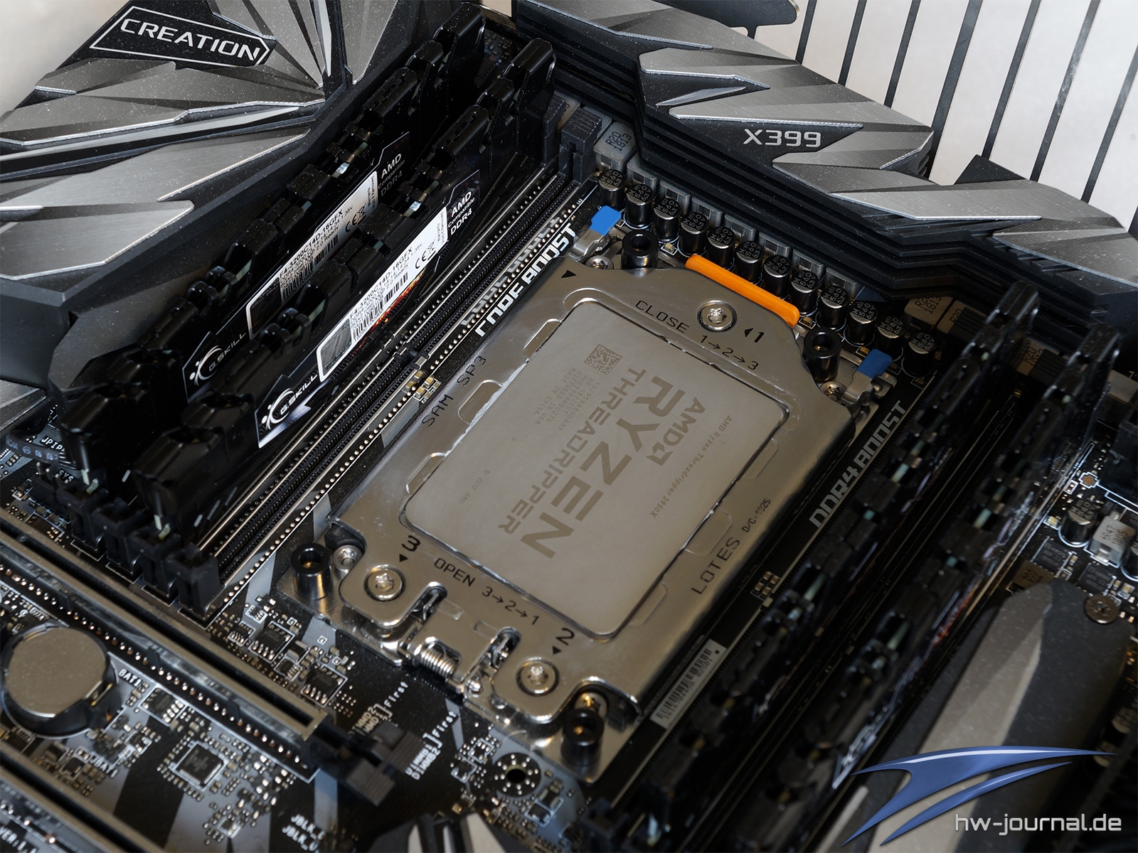 Um die Threadripper Kühler überhaupt testen zu können, braucht es natürlich auch den passenden Unterbau. Wir haben das MSI MEG X399 CREATION als Mainboard gewählt, da es den stabilsten Betrieb der CPUs zulässt. Hier haben wir den AMD Threadripper 2950X gewählt, welcher zusammen mit 4x 8GB G.Skill Flare Arbeitsspeicher platz nimmt. Der Aufbau ist offen gestaltet, weshalb wir auch auf einen Messwert der Lautstärke verzichten. Es lässt sich hier einfach keine sinnvolle Platzierung des Mikrofons finden.