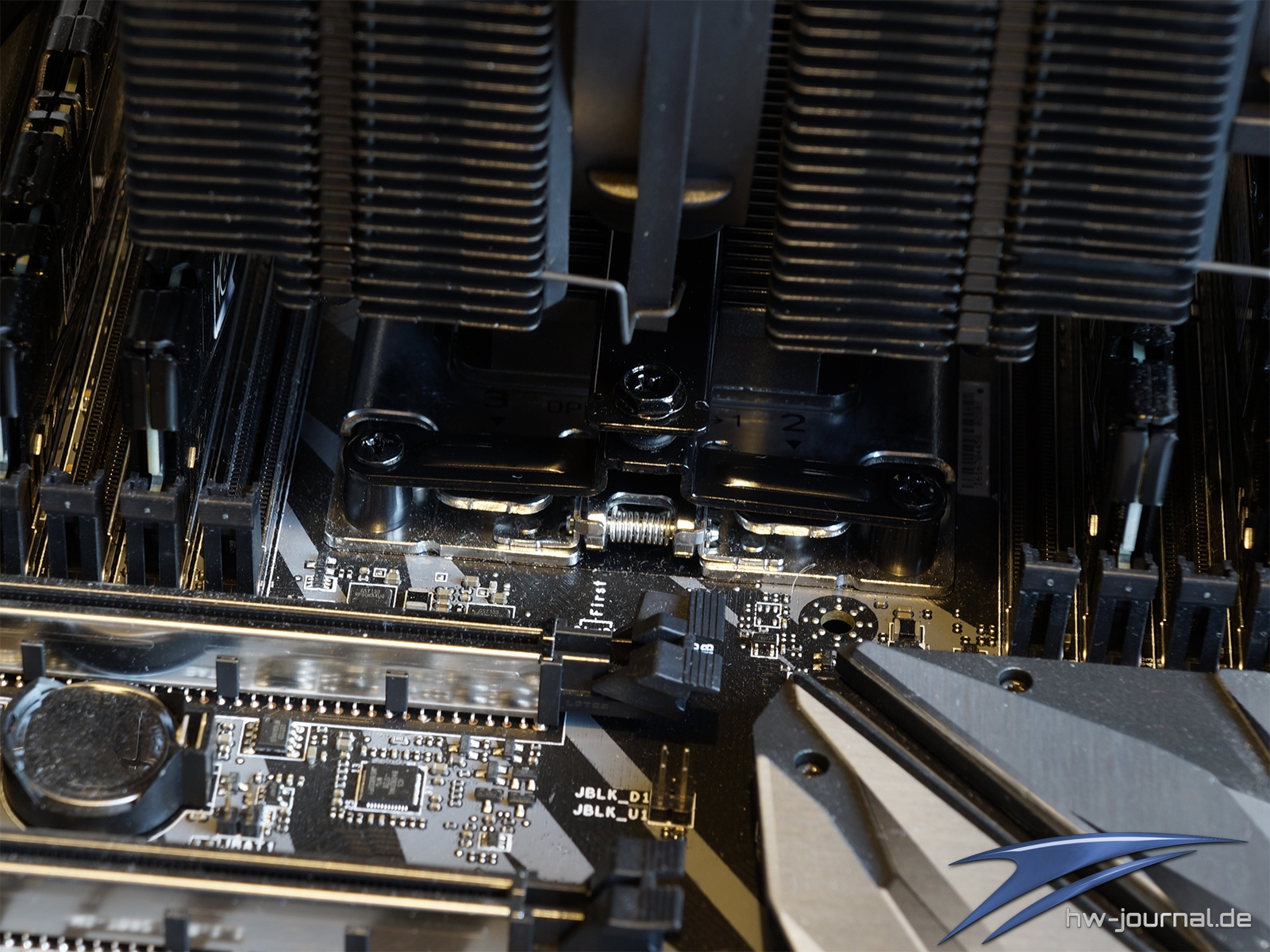 Schwer oder umständlich kann man die Montage also nicht nennen. Der Hersteller empfiehlt allerdings auch, dass man dies im ausgebauten Zustand des Mainboards vornehmen sollte - Wir auch. Denn es wäre im Nachgang schon umständlich auch den mittleren Lüfter wieder zu befestigen, sollte sich der Koloss in einem Gehäuse befinden.