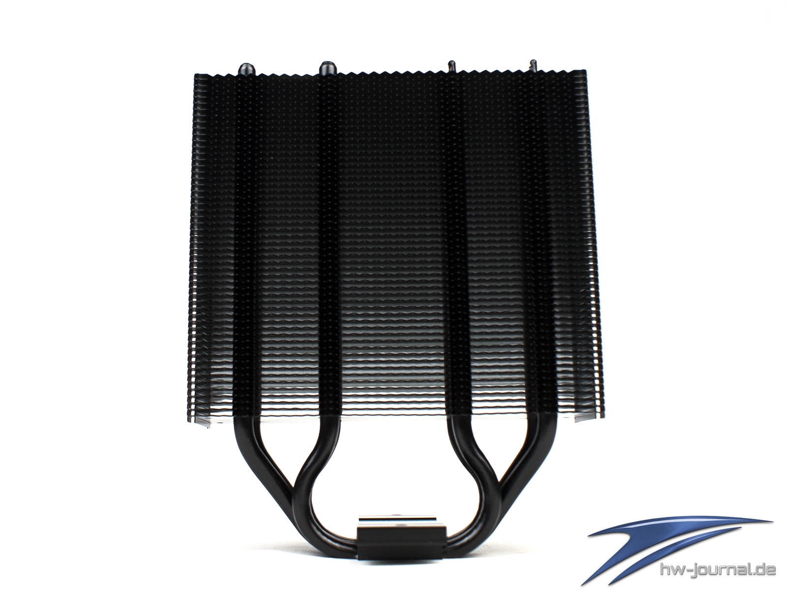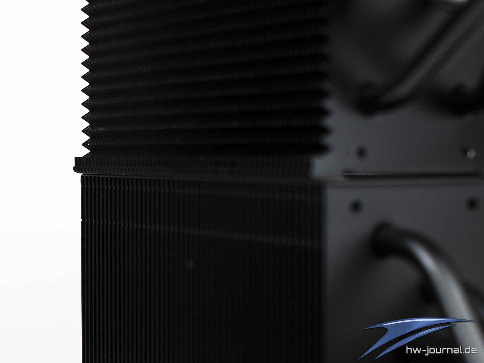 Aber auch der Kühler selbst wurde in die Hand genommen. Änderungen wurden hier bei der Ausrichtung der Heatpipes durchgeführt. Zuvor sind diese nicht auf einer Linie, sondern etwas verteilt gewesen. Nun befinden sich pro Seite immer zwei Heatpipes auf einer Linie. Somit wird dem Luftzug durch die Finnen insgesamt etwas weniger Stirnfläche an den Pipes geboten. Der Airflow ist somit verbessert und dürfte auch die Lautstärke etwas reduzieren. Die Auflageflächen der Lüfter an den Finnen sind ein weiterer Punkt auf der Liste der Anpassungen. Statt einer ebenen bzw. geraden Kante sind die Finnen an beiden Fronten nun gezackt. Auswirken sollte sich dies auf die Lautstärke und auch die Leistung - Stichwort Verwirbelungen.