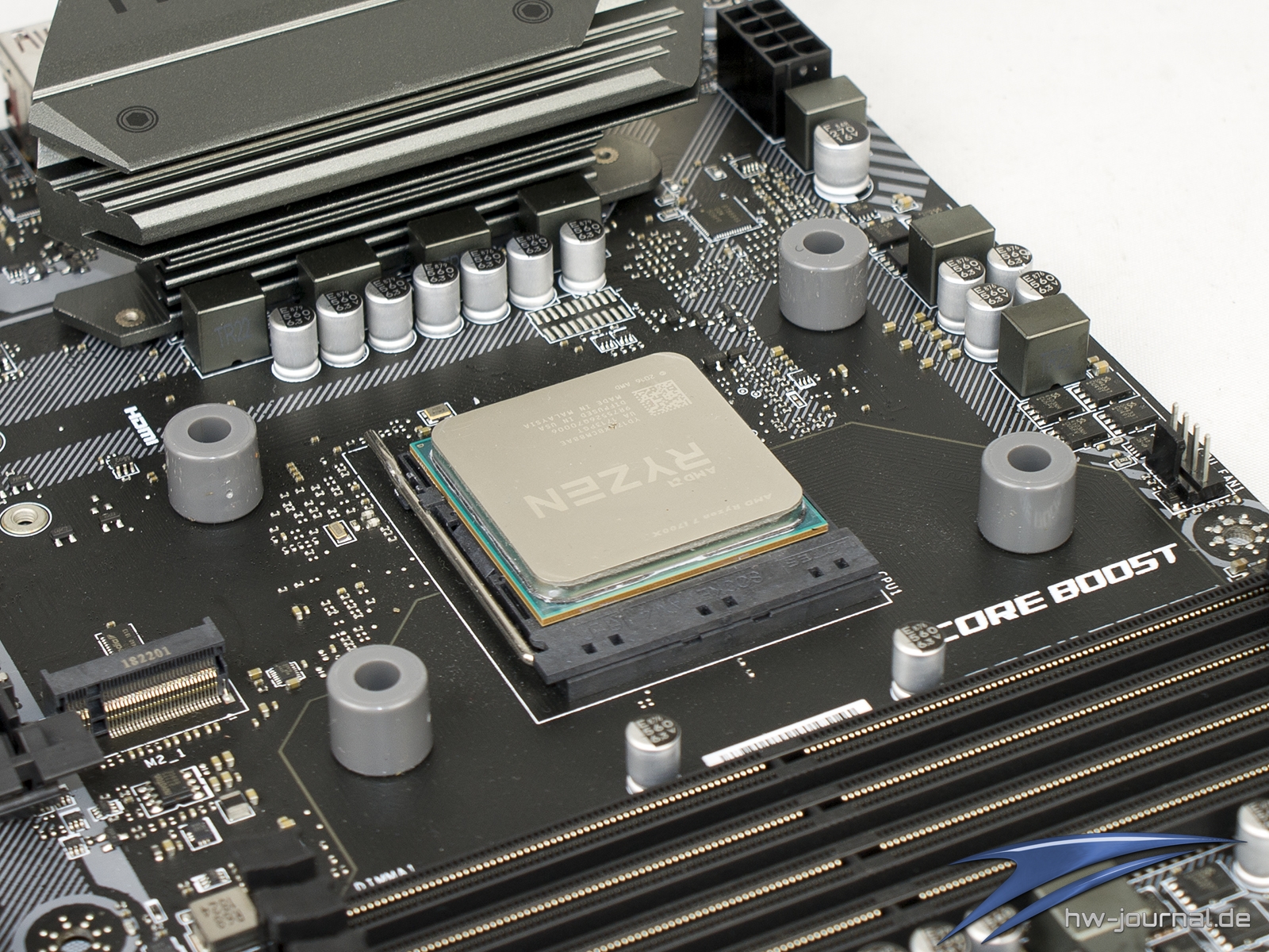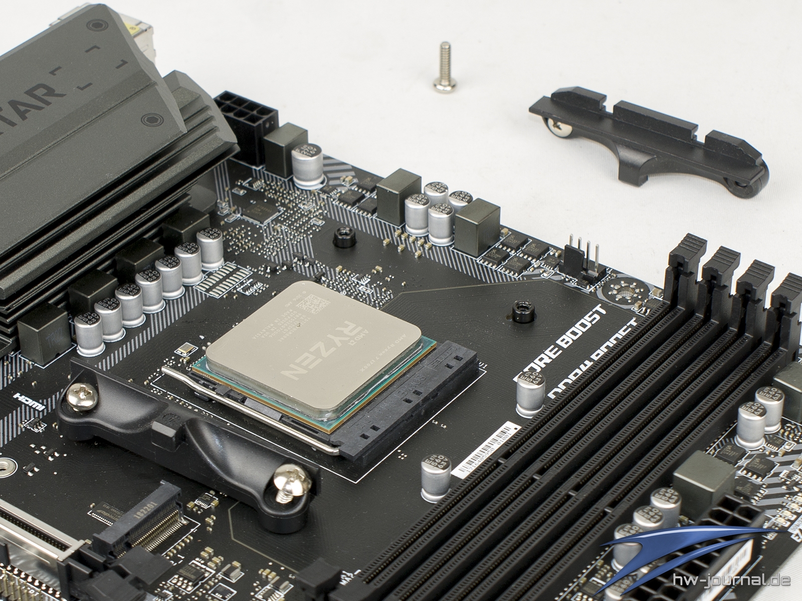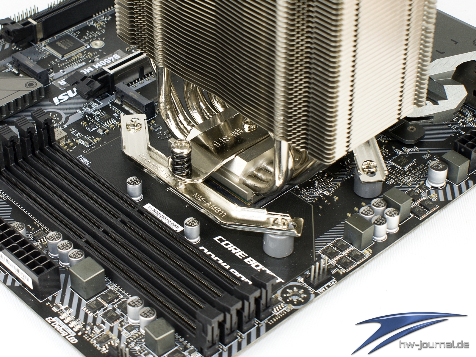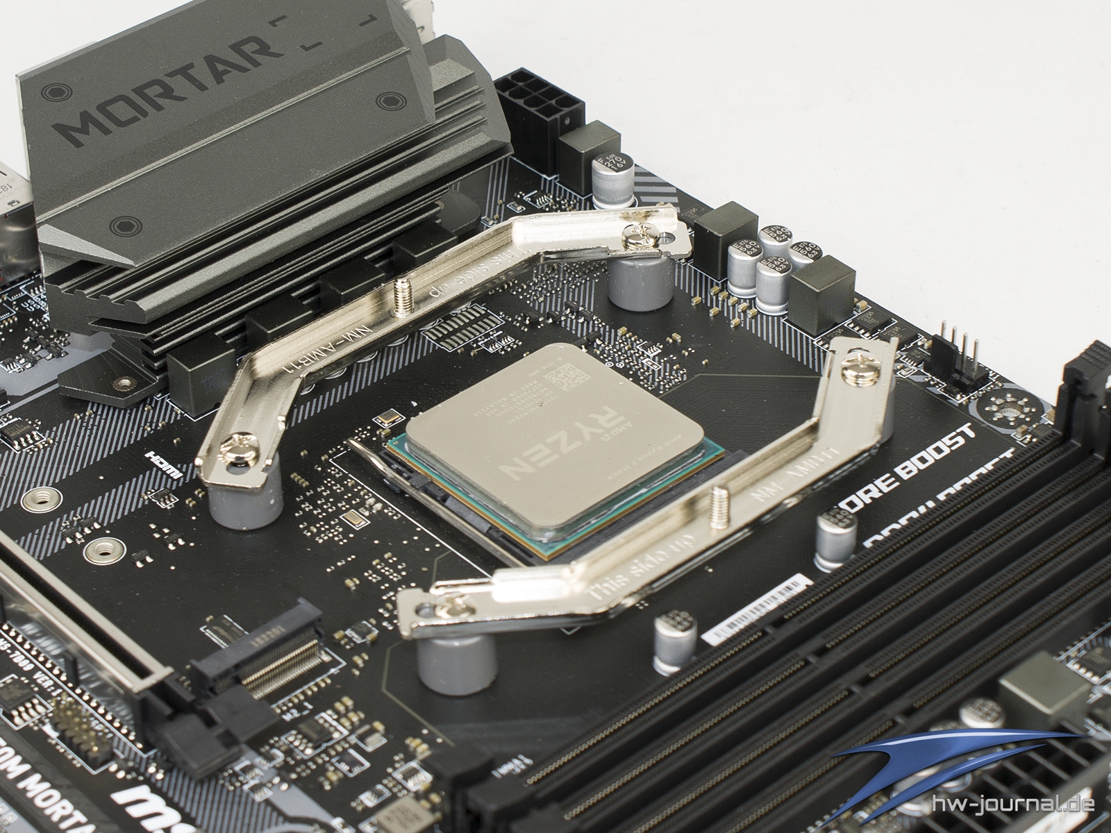 Danach legt man die Brücken bereits auf und fixiert diese mit den vier Schrauben. Clevererweise kann hierzu der beiliegende Schraubendreher benutzt werden. Auf dem demonstrativ verwendeten Msi B450M Mortar kommt es bis hier zu keinen Konflikten, was aber auch verwunderlich wäre.