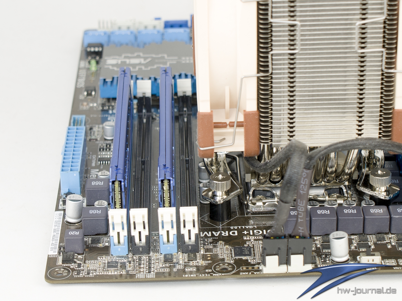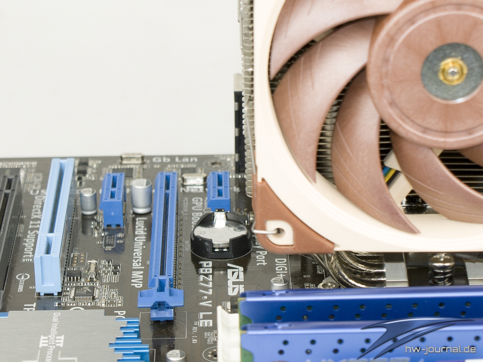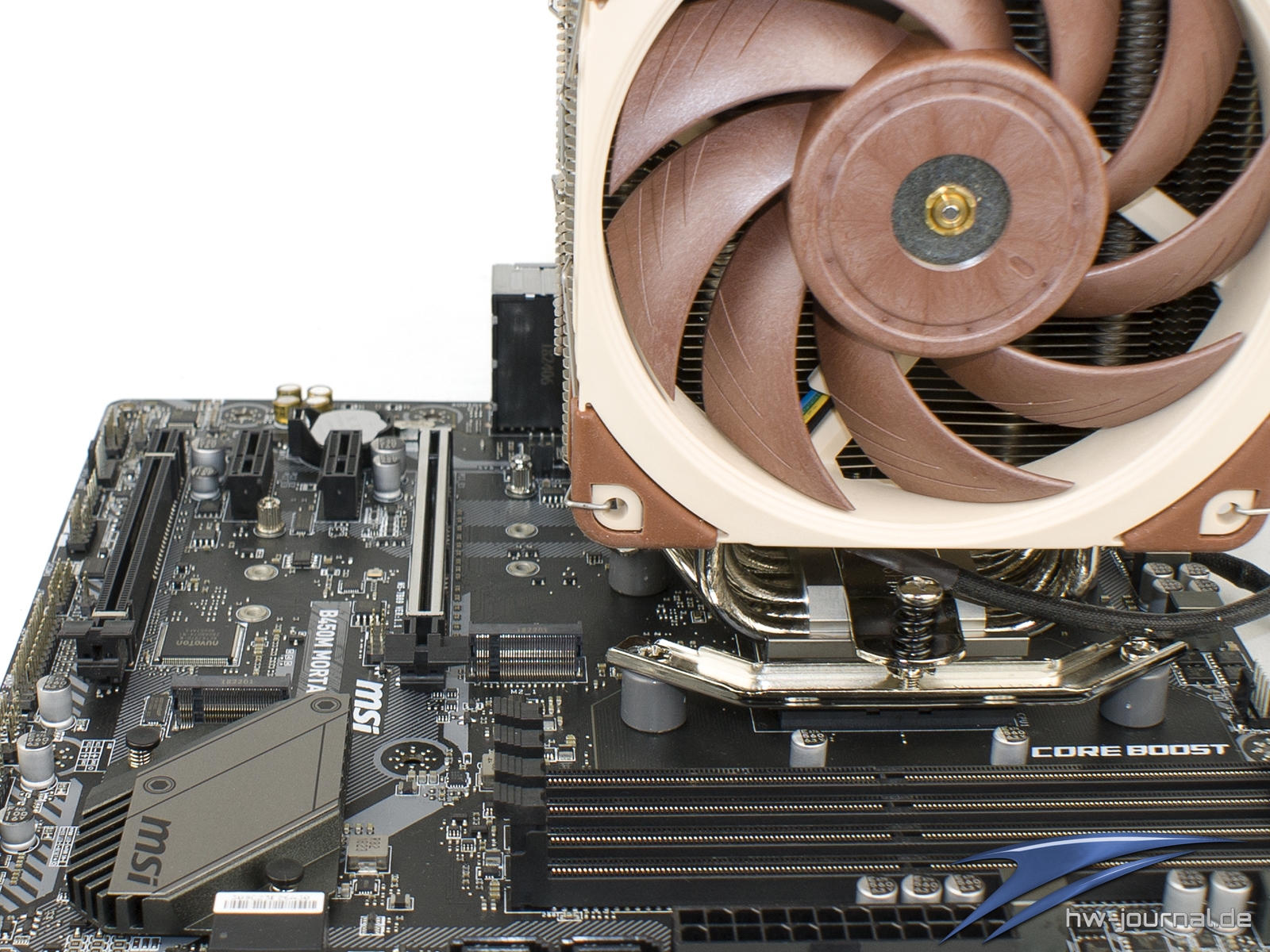 Konflikte bleiben auch hier Fehlanzeige. Der Kühler thront samt Lüftern sozusagen luftig auf dem Sockel. Weder die RAM-Slots, noch der erste PCIe-Slot werden beeinträchtigt. Nach hinten dürfte es auch mit den wenigsten Boards Probleme geben. Das Mortar baut nämlich schon recht hoch.