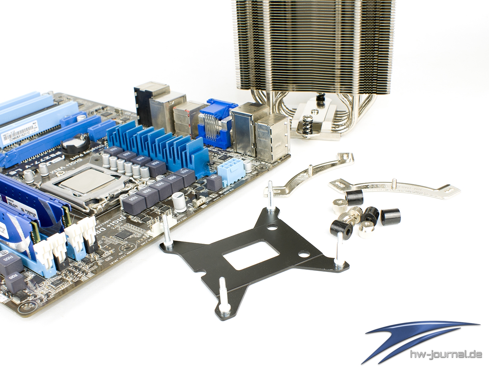 Die Brücken müssen sozusagen senkrecht montiert werden, damit der Kühler einen waagerechten Flow erfährt. Anders als bei der AMD Montage, könnte man den Kühler hier nämlich auch theoretisch um 90° drehen. Die weiteren Schritte gleichen denen bei der AMD Montage. Kühler auflegen, schrauben festziehen und Lüfter befestigen.