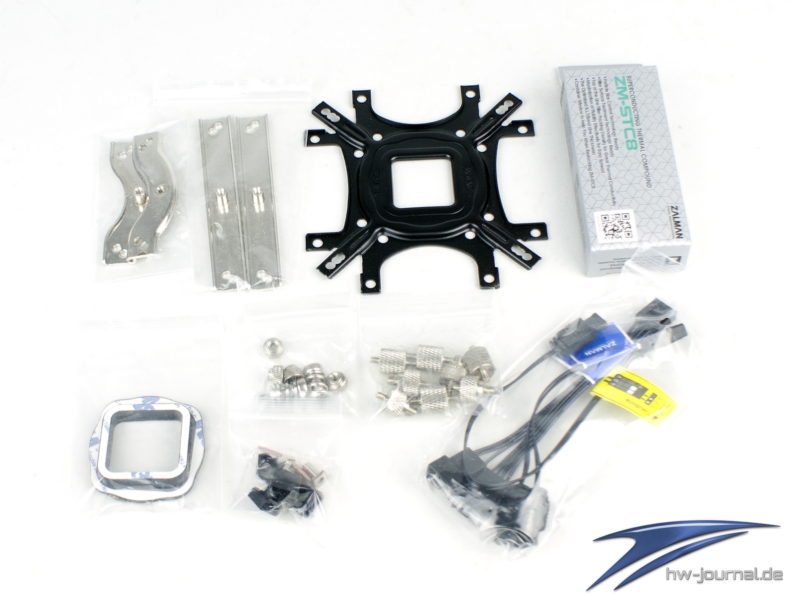 Die Komponenten des Kühlers sind in getrennten Kartons verstaut. Selbst die Wärmeleitpaste ist verpackt wie ein Retail-Produkt. Beim vorliegenden Sample haben zwar die Anleitungen gefehlt, aber diese findet man auch auf der Produktseite. Durch das beigelegte Material ist der Kühler kompatibel zu folgenden Sockeln.
