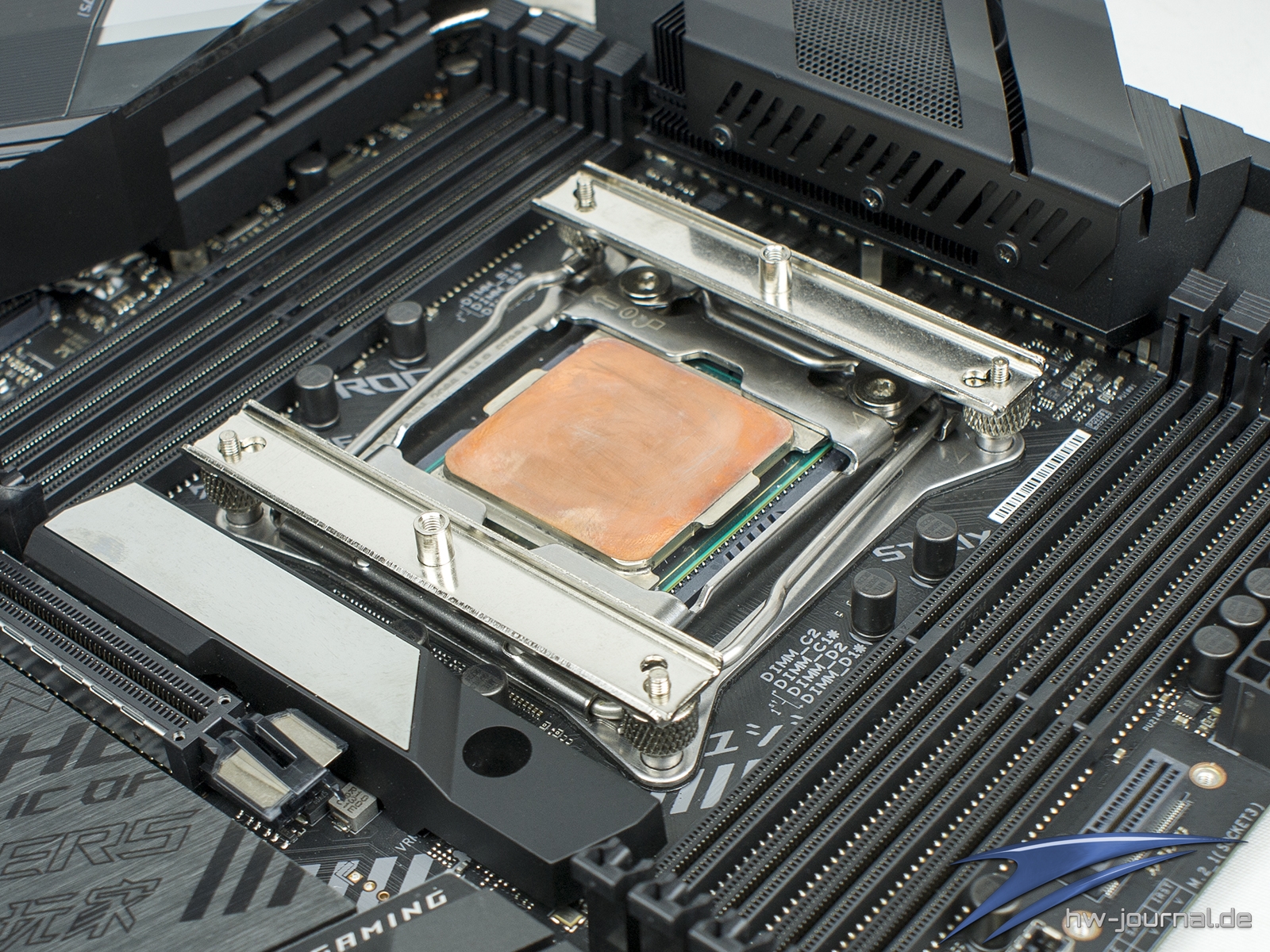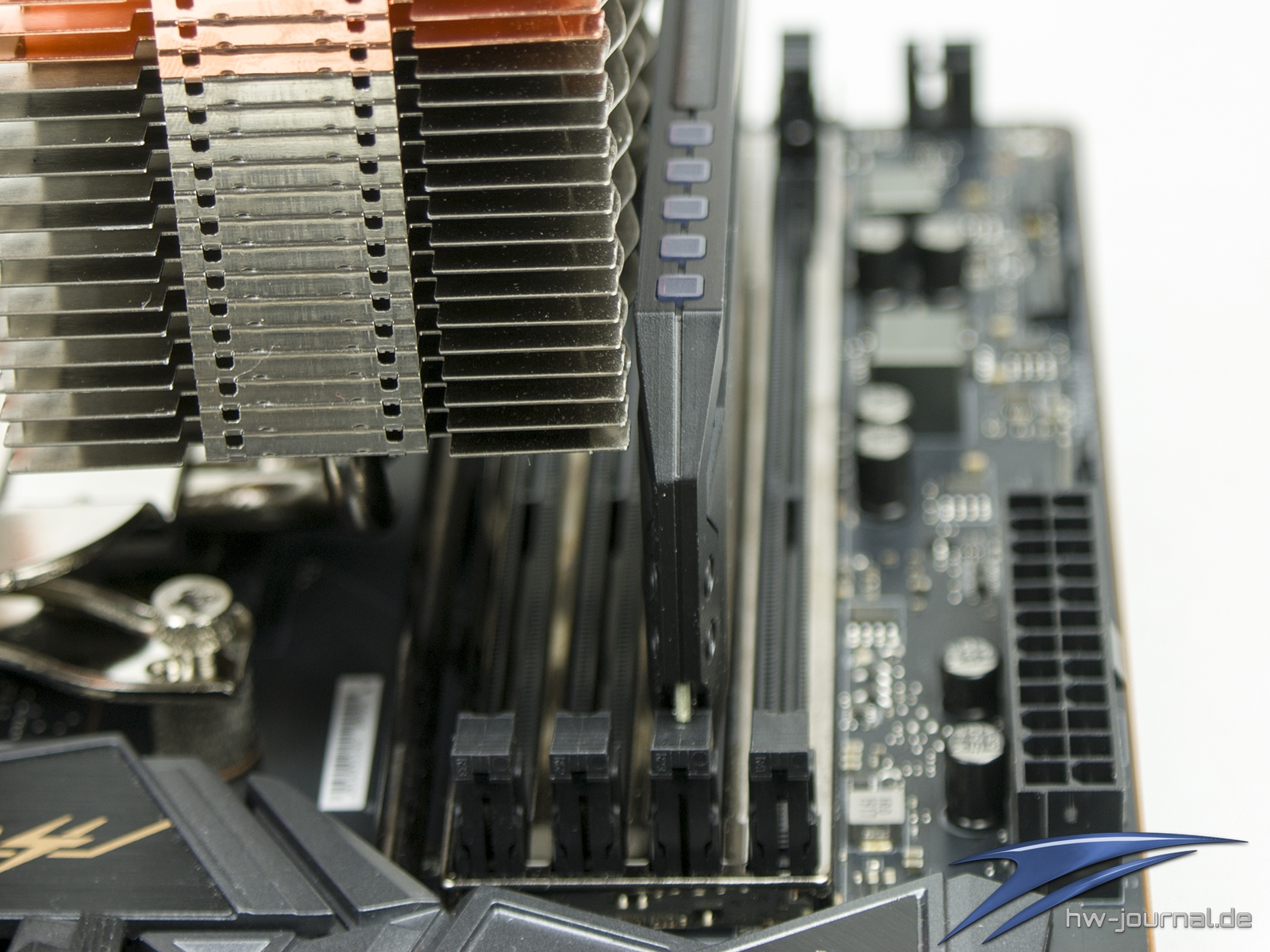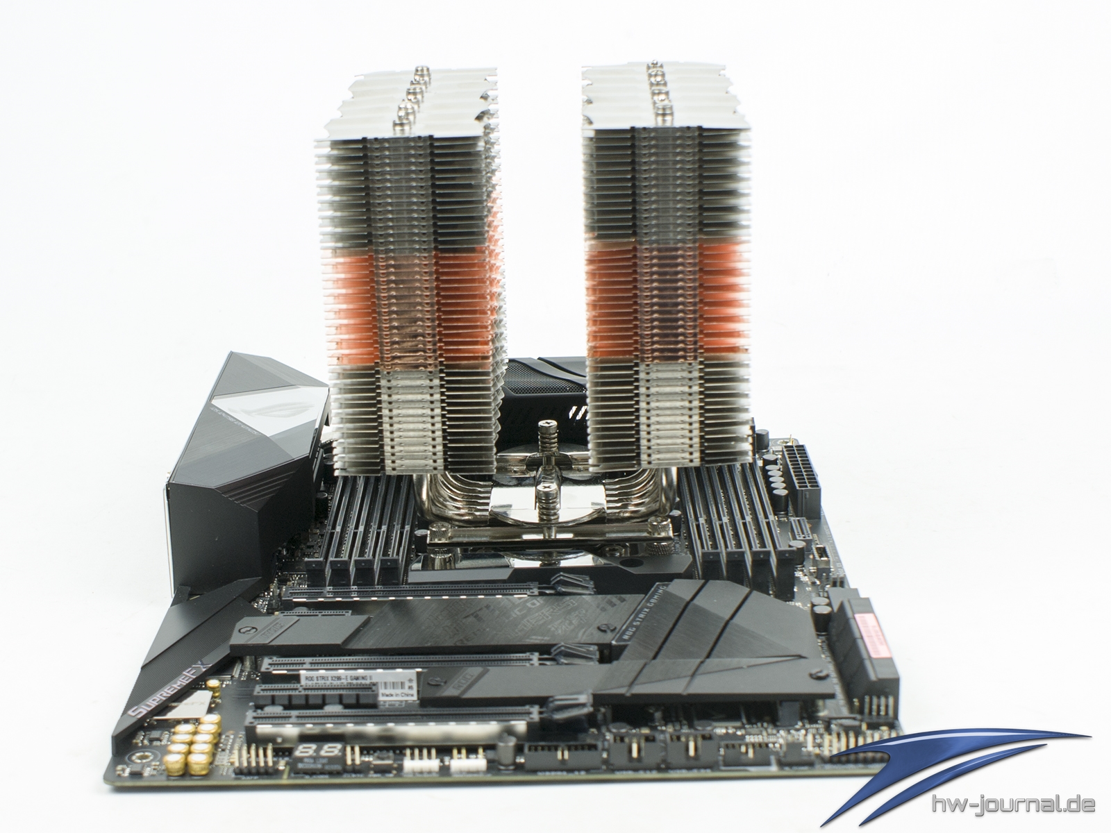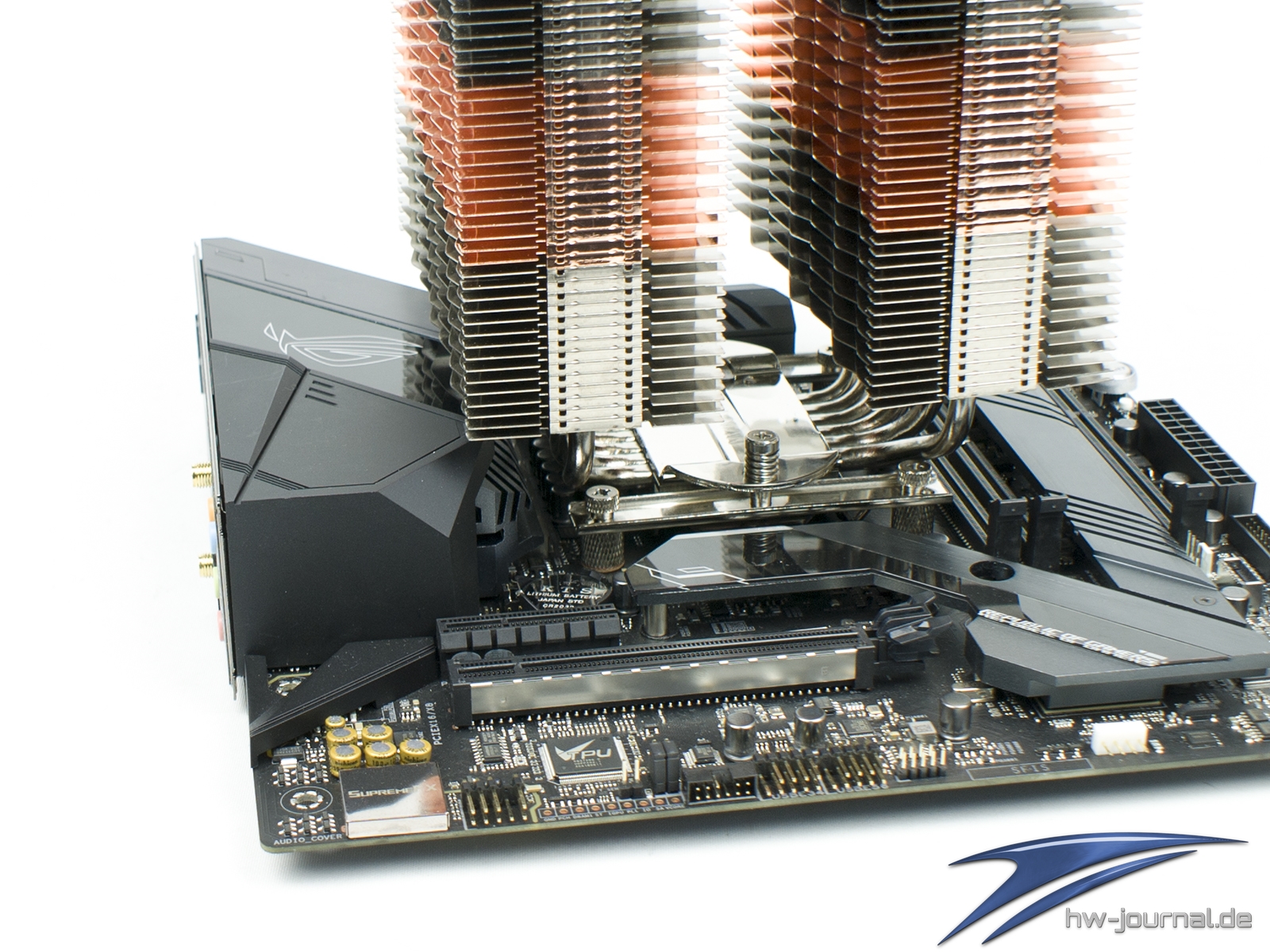 Beim Sockel Intell 2066 fällt der Aufwand mal wieder deutlich geringer aus. Hier braucht es die Backplate natürlich nicht. Die passenden Gewindestifte werden direkt in den Sockel geschraubt. Auf diese legt man dann auch schon die Brücken auf. Geachtet werden muss auf die Orientierung. Die ungenutzen Löcher müssen Richtung CPU zeigen, zudem muss man sie oben und unten montieren, damit der Lüfter Richtung Heck zeigt. Fixiert werden sie wieder mit den Rändelmuttern. Danach kommt auch schon der Kühler, welcher mit den Federschrauben gesichert wird. Beim ASUS ROG Strix X299-E Gaming II stellte sich das noch schwieriger dar, da der VRM-Kühler so hoch baut. Man kommt hier kaum an das obere Gewinde. Auch beim Sockel X299 werden die RAM-Slots natürlich deutlich überlappt und auch zum ersten PCIe-Slot ist nicht viel Freiraum vorhanden.