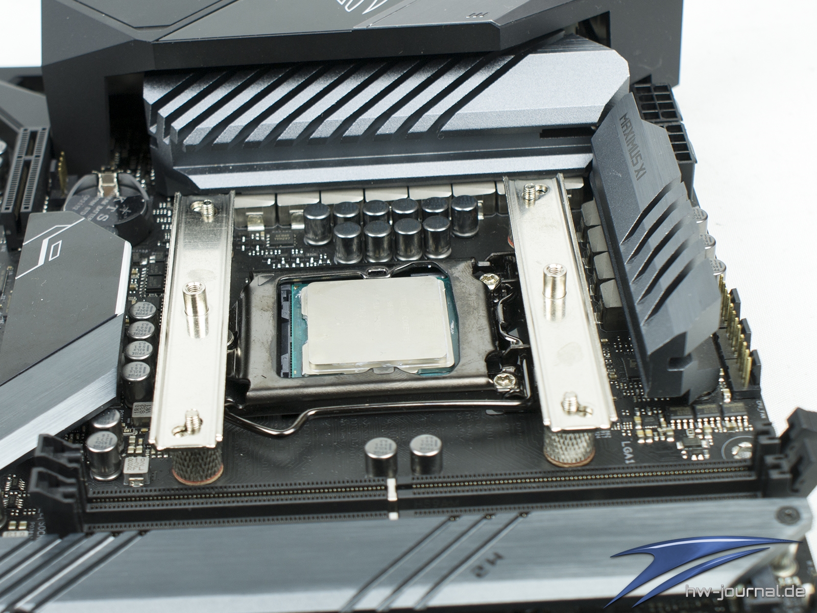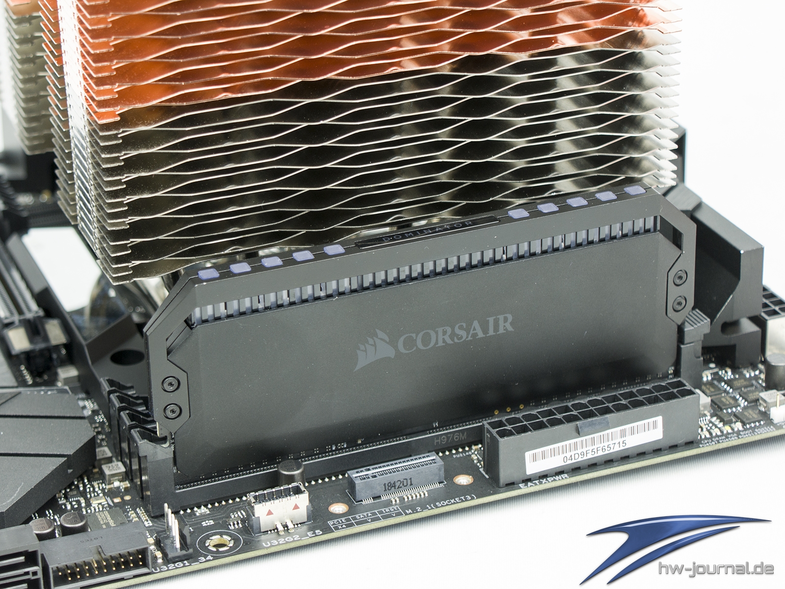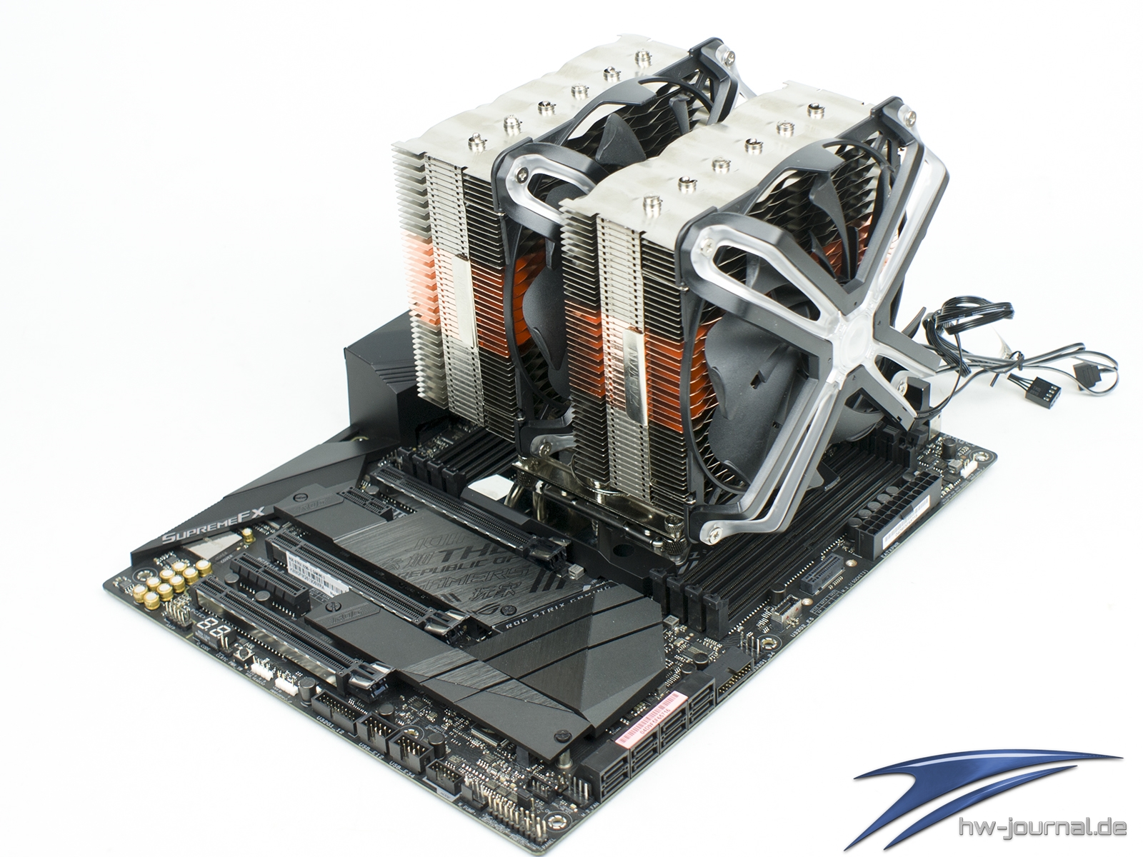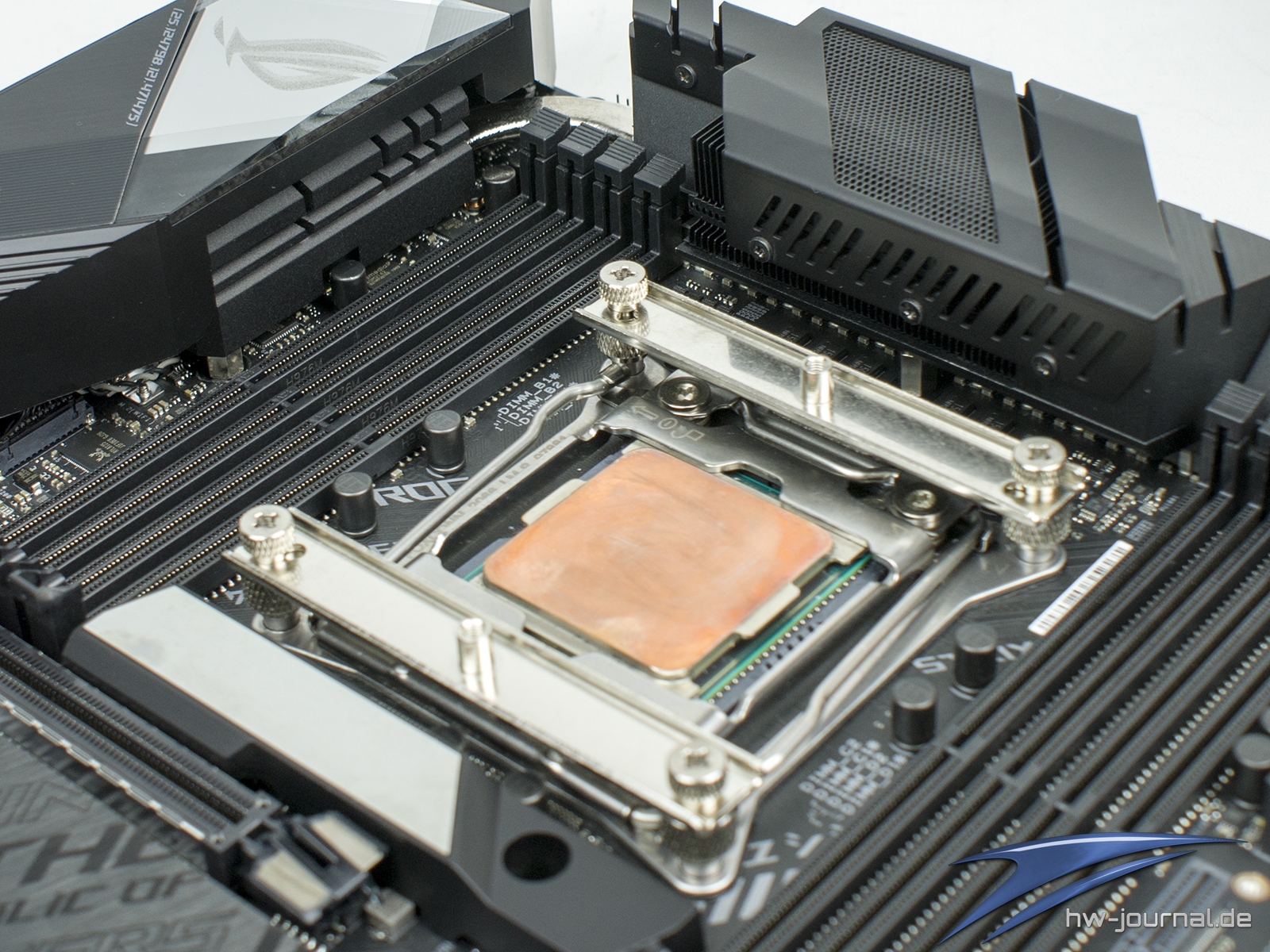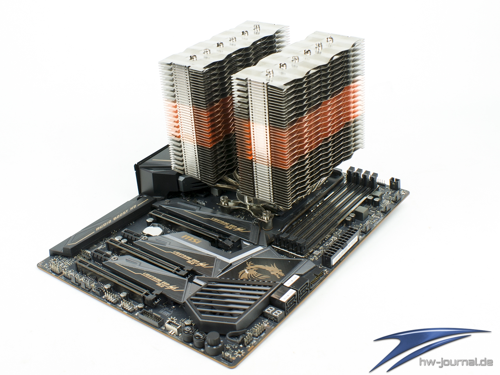 Beim Sockel Intell 2066 fällt der Aufwand mal wieder deutlich geringer aus. Hier braucht es die Backplate natürlich nicht. Die passenden Gewindestifte werden direkt in den Sockel geschraubt. Auf diese legt man dann auch schon die Brücken auf. Geachtet werden muss auf die Orientierung. Die ungenutzen Löcher müssen Richtung CPU zeigen, zudem muss man sie oben und unten montieren, damit der Lüfter Richtung Heck zeigt. Fixiert werden sie wieder mit den Rändelmuttern. Danach kommt auch schon der Kühler, welcher mit den Federschrauben gesichert wird. Beim ASUS ROG Strix X299-E Gaming II stellte sich das noch schwieriger dar, da der VRM-Kühler so hoch baut. Man kommt hier kaum an das obere Gewinde. Auch beim Sockel X299 werden die RAM-Slots natürlich deutlich überlappt und auch zum ersten PCIe-Slot ist nicht viel Freiraum vorhanden.