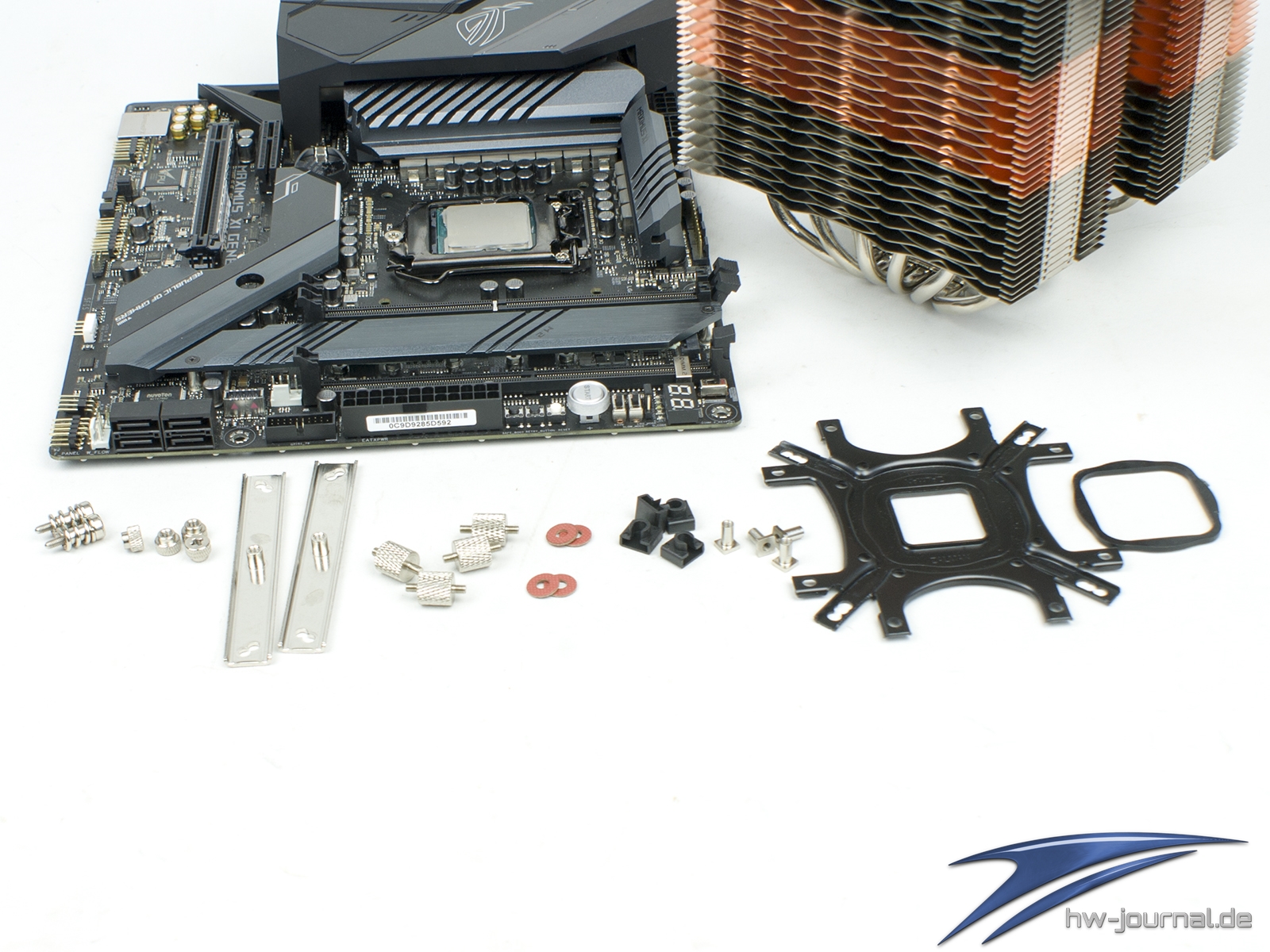 Der Sockel Intel 115X stellt wieder eine Mischung der vorherigen dar. Es wird auf der Backplate die etwas größere Gummi-Sticker aufgeklebt, natürlich auf der anderen Seite als bei AM4. Die Gewindehülsen werden identisch befestigt. Für den Sockel 115X braucht es das mittlere Loch der drei. Das Auflegen der Backplate läuft hier allerdings dann nicht so einfach ab. Die Hülsen passen so exakt, dass es hakelig von Statten läuft alle vier in durch die Löcher zu führen. Auf der Vorderseite schließen sie bündig ab, sodass die roten Scheiben beim vertikalen Einbau direkt mit den Abstandshaltern gesichert werden müssen. Bei horizontaler Montage kann man entspannter zu Werke gehen. Die Brücken werden wieder unten und oben aufgelegt, sodass die unbenutzten Löcher diesmal nach außen zeigen. Der Kühler nimmt auf dem ASUS ROG Maximus XI Gene ohne weitere Probleme Platz. Natürlich werden die beiden RAM-Slots komplett verdeckt, aber das ist auf den anderen Plattformen nicht anders.