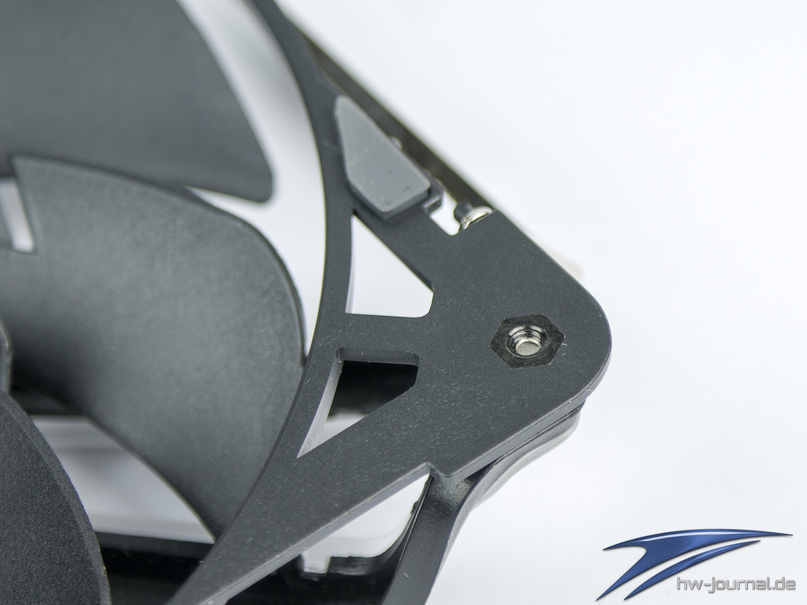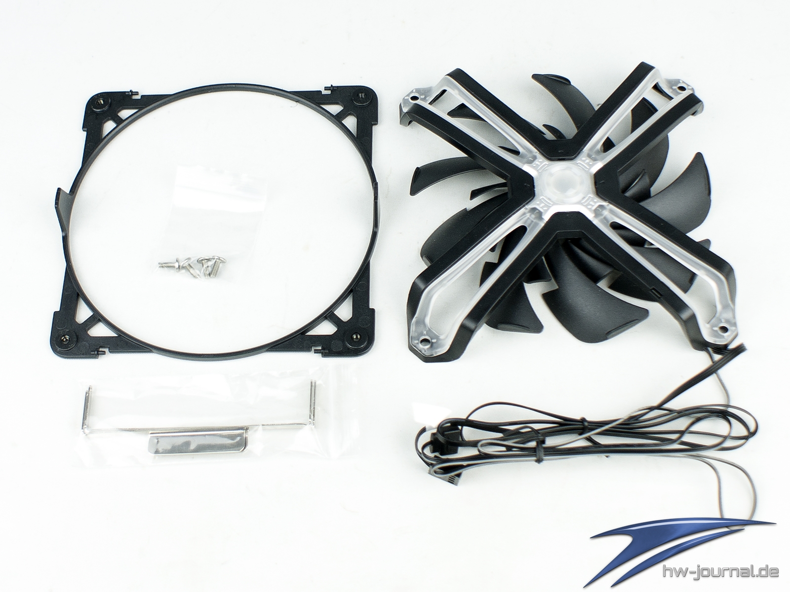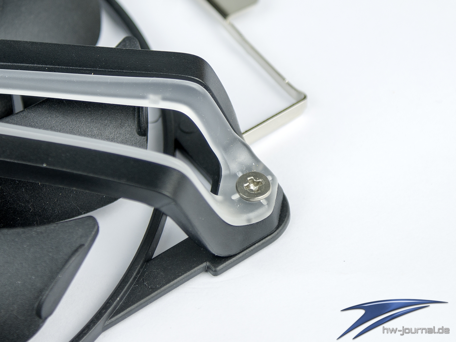 Bevor es an die Montage auf den einzelnen Sockeln geht, müssen zuvor auch noch die Lüfter vorbereitet werden. Das Material dazu befindet sich im jerweiligen Karton. Zunächst muss man den Lüfter auf dem Rahmen aufschrauben. Positiv ist hier, dass in diesen Gewinde bzw. Muttern eingearbeitet wurden und man nicht in das Kunststoff schraubt. Danach werden die Metallbügel seitlich eingehängt. Das war es dann auch schon. Beim Aufschrauben kann man sich bereits Gedanken machen, wie man die Kabel führen möchte.