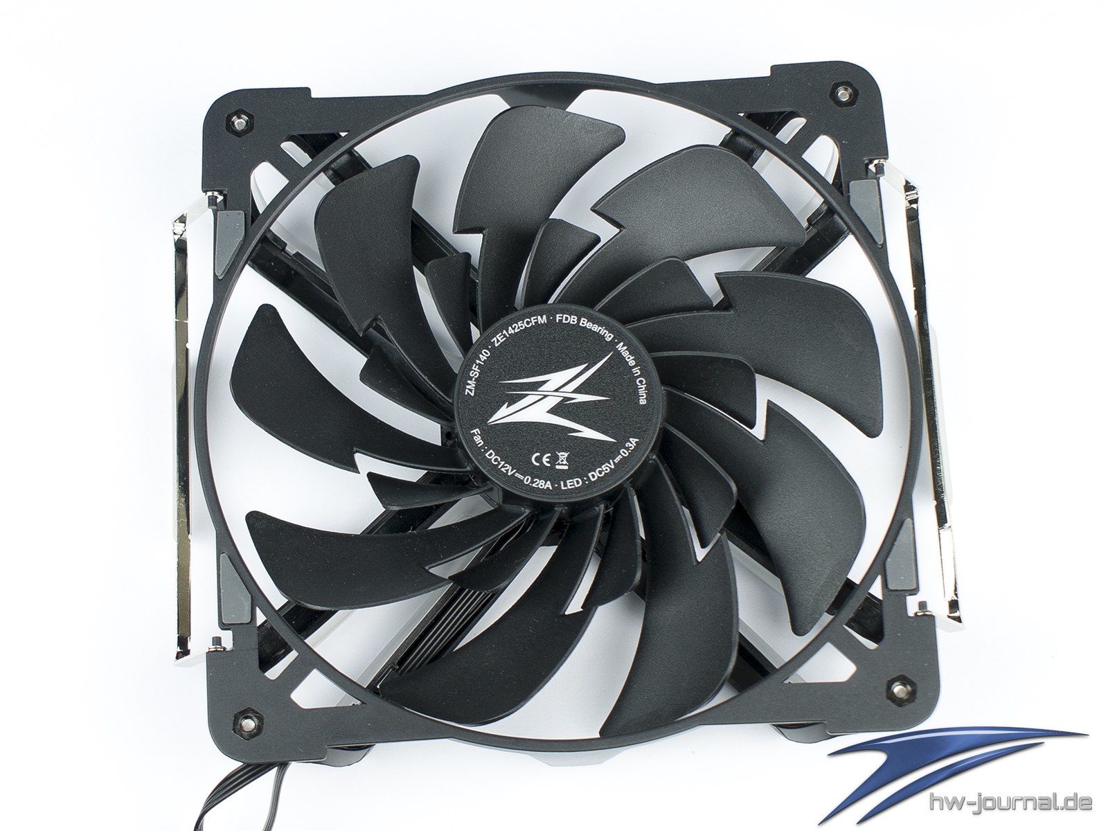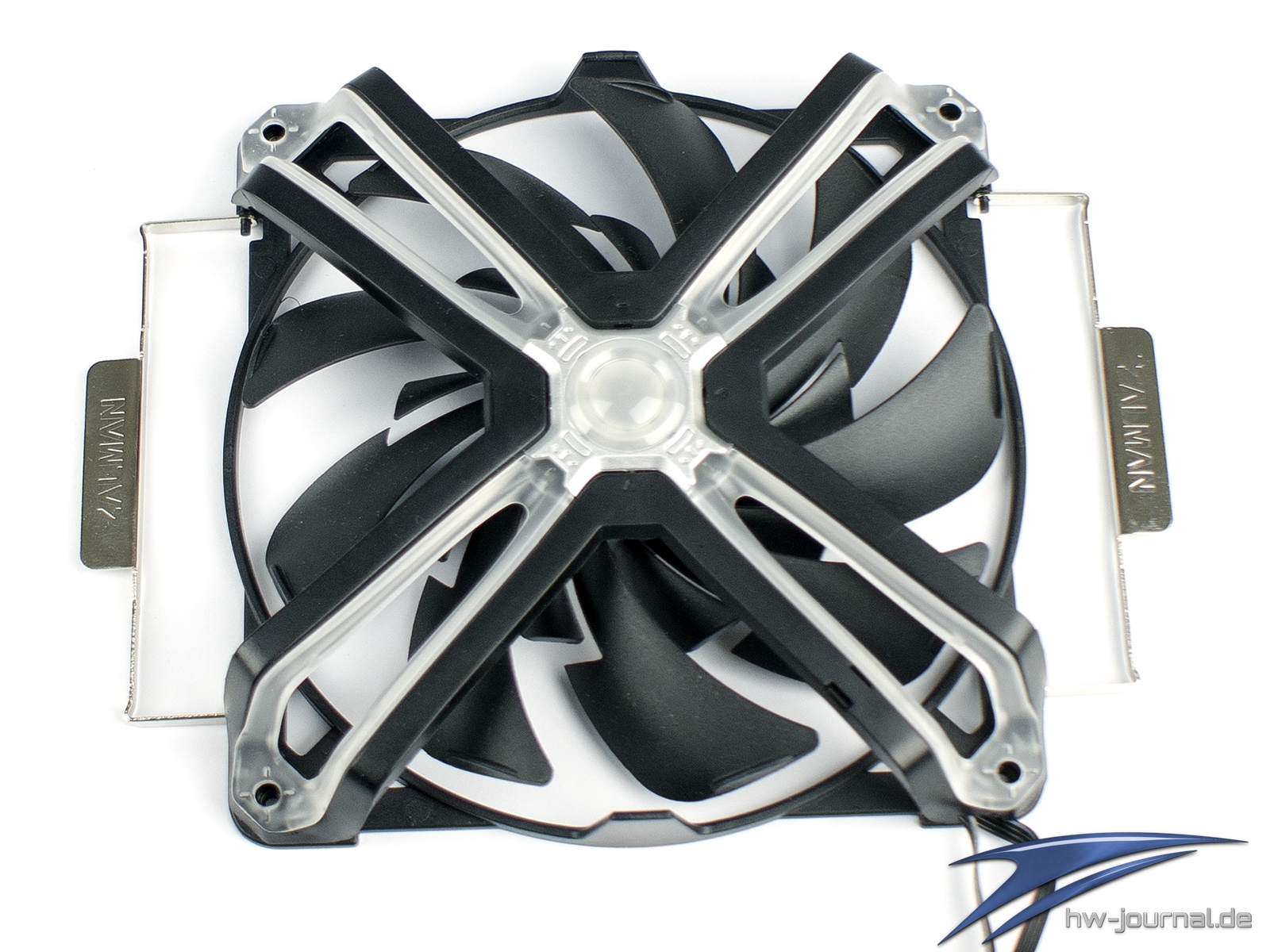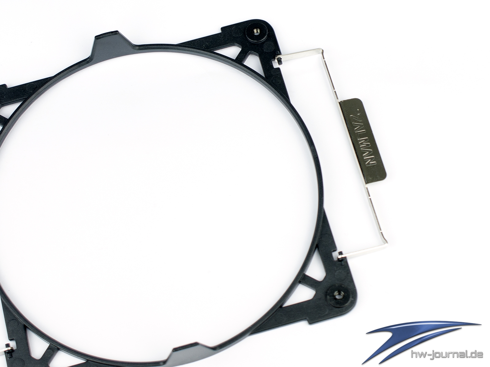 Bevor es an die Montage auf den einzelnen Sockeln geht, müssen zuvor auch noch die Lüfter vorbereitet werden. Das Material dazu befindet sich im jerweiligen Karton. Zunächst muss man den Lüfter auf dem Rahmen aufschrauben. Positiv ist hier, dass in diesen Gewinde bzw. Muttern eingearbeitet wurden und man nicht in das Kunststoff schraubt. Danach werden die Metallbügel seitlich eingehängt. Das war es dann auch schon. Beim Aufschrauben kann man sich bereits Gedanken machen, wie man die Kabel führen möchte.