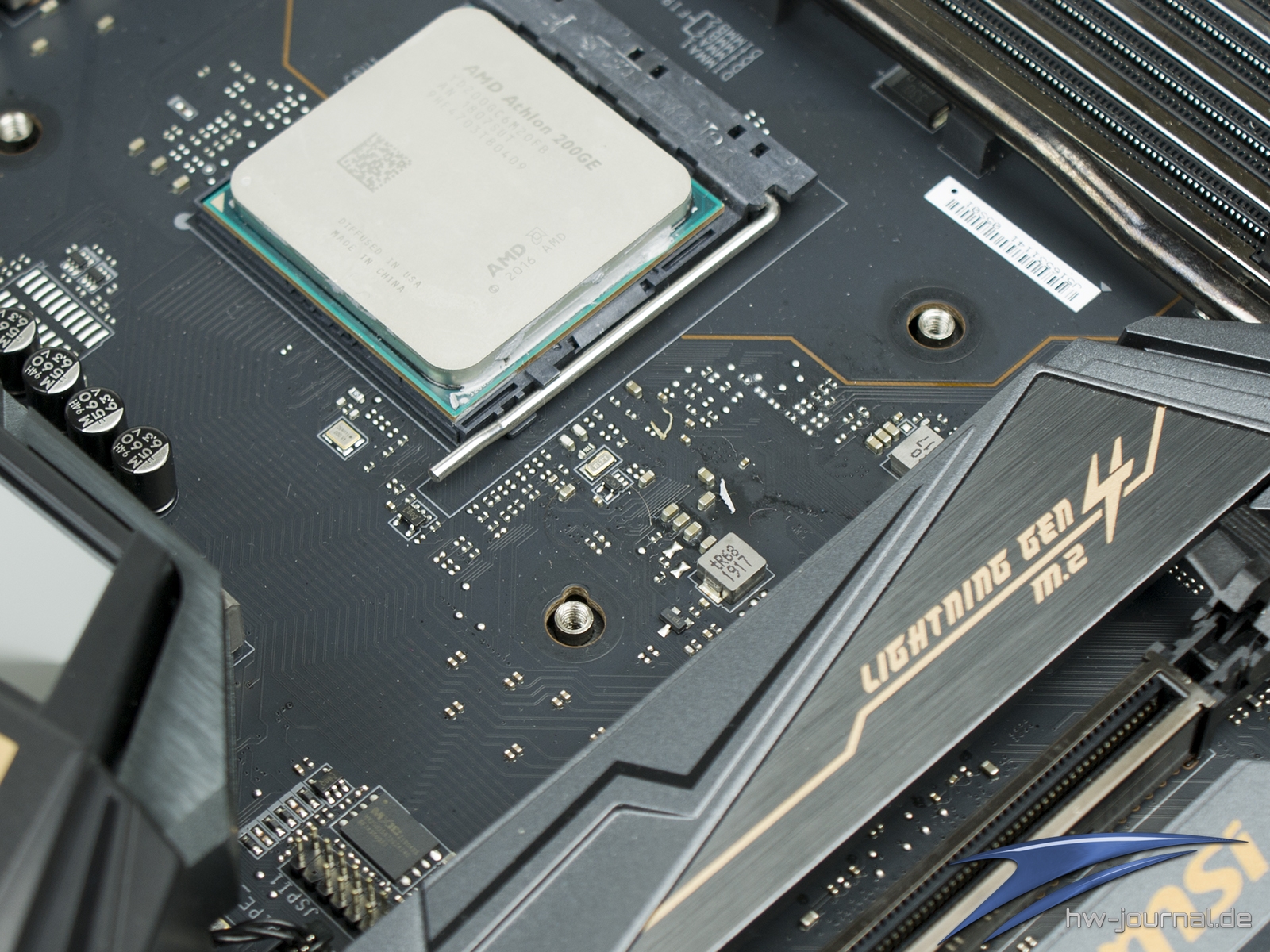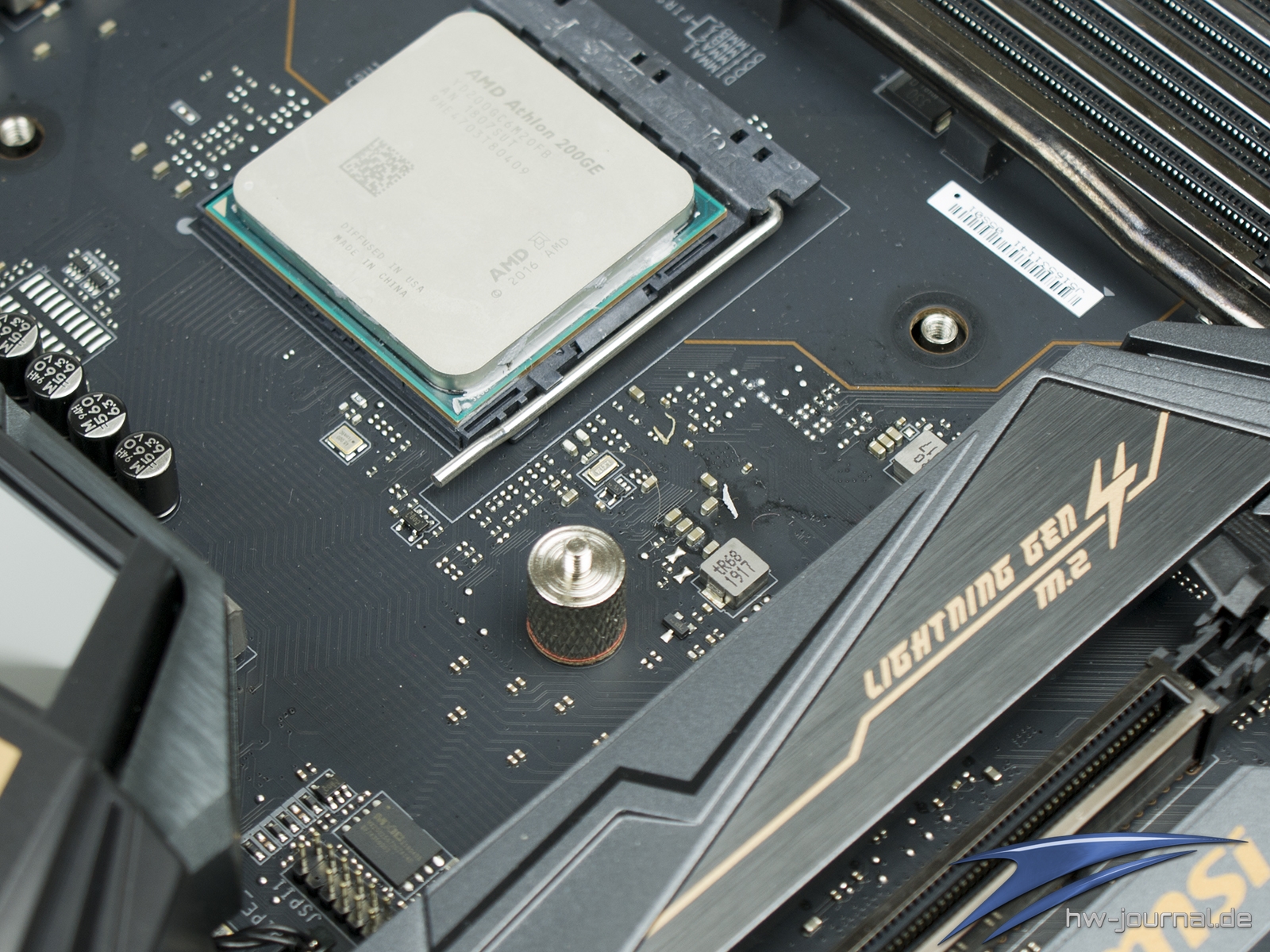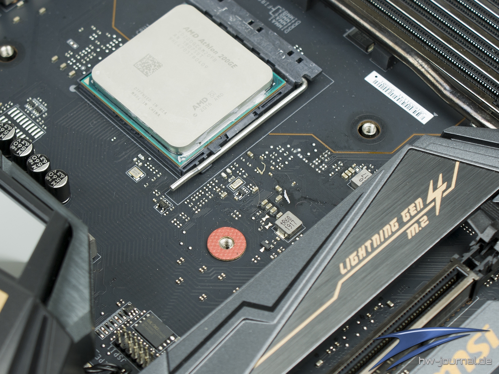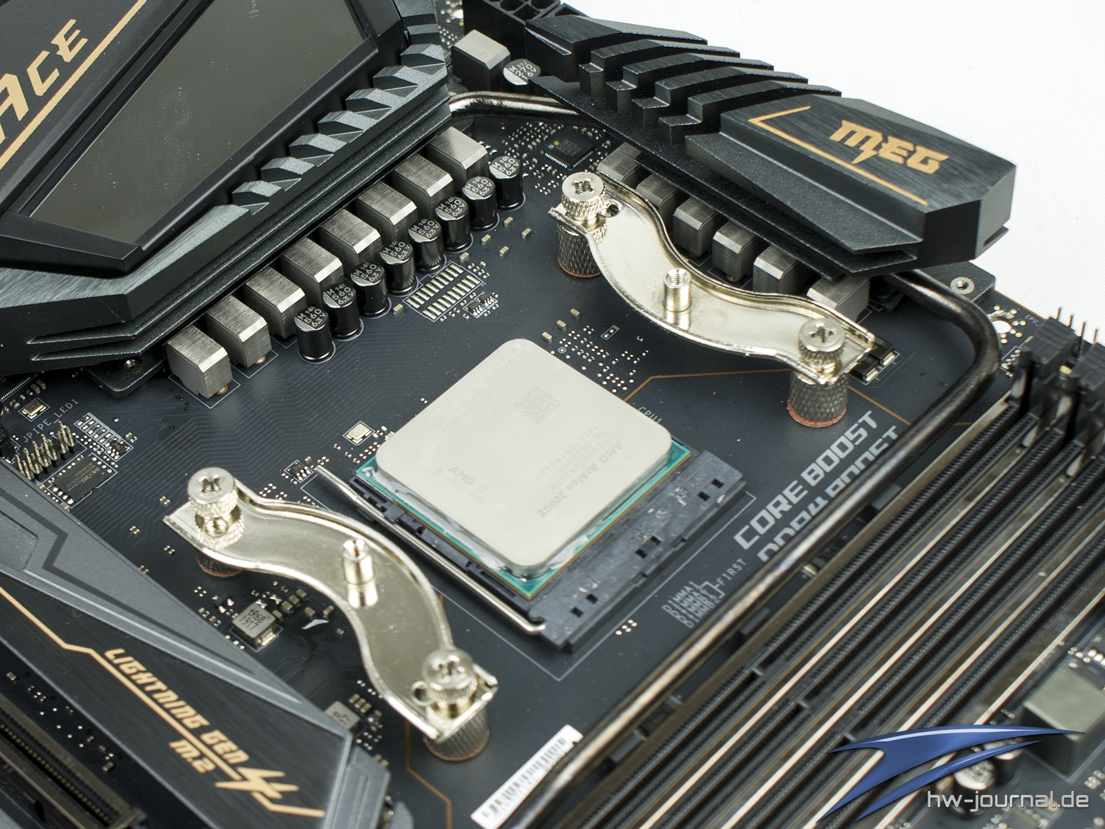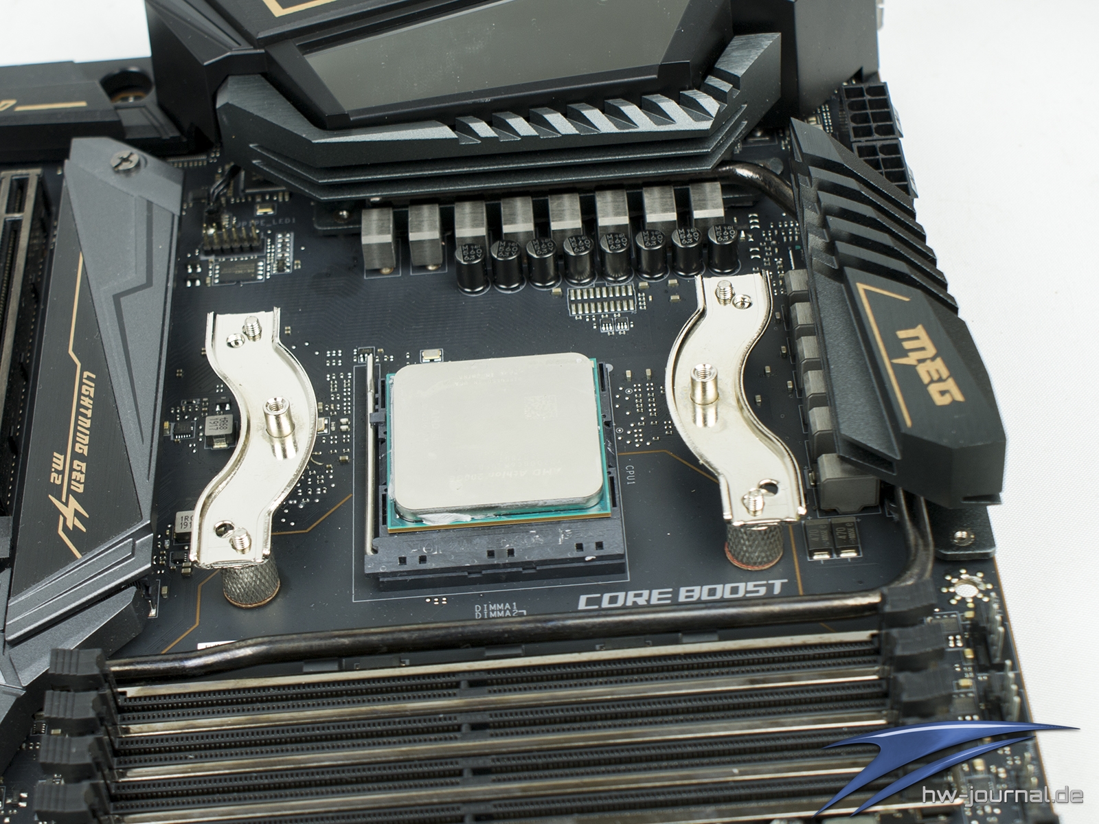 Beim Sockel AMD AM4 Sockel hat sich auf dem ersten Bild ein Fehler eingeschlichen. Hier müssten natürlich die kurzen Montagebrücken liegen. Ansonsten wird eigentlich fast das selbe wie beim Sockel Intel 115X benötigt. Einzig der Gummi-Sticker ist noch ein anderer. Dieser stellt auch den ersten Schritt dar. Folie abgezogen und auf der passenden Seite aufgeklebt. Danach geht es mit den Gewindehülsen weiter. Beim Sockel AM4 sucht man sich die seitlichen Löcher, welche nicht auf der Seite des eingestanzten Zalman Schriftzugs befindlich sind. Sie werden eingeschoben und mit den schwarzen Kunststoff-Clips gesichert. Ein ähnliches Prinzip wie bei Cooler Master (bspw. Cooler Master Hyper 212 BE) . Danach kann man die Backplate schon auflegen. Auf der anderen Seite werden dann die roten Scheiben aufgelegt, bevor man die Gewinde-Stifte einschraubt. Danach kann man schon die Brücken auflegen und anschließen mit den Muttern fixieren. Die Wölbung der Brücken zeigt dabei Richtung CPU. Nun folgt auch schon der Kühler, welcher hier noch ohne Lüfter sein sollte. Die beiden Feder-Schrauben in die Gewinde zu führen ist aufgrund der Größe der beiden Türme nicht so einfach. Man sollte sich einem langen Schraubendrehers mit Magnet-Kopf bedienen. Auf dem MSI MEG X570 ACE gibt es soweit eigentlich keine Platprobleme, außer beim RAM. Selbst im dritten Slot wird es für den Corsair Dominator Platinum RGB extrem eng. Die Höhe des RAMs schließt diesen aber eh aus.