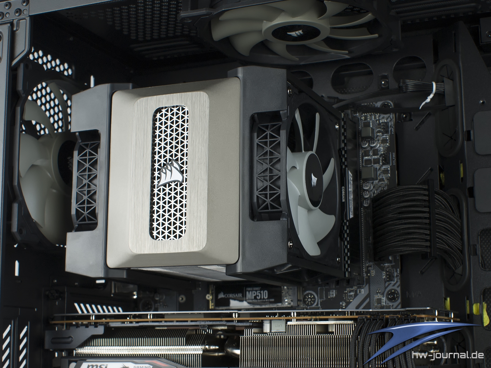 Mit Energie wird das System durch ein Corsair RM650 versorgt. Das Netzteil ist mit einer 80 PLUS Gold Effizienz zertifiziert und mit einem 135mm Lüfter versehen. Dieser springt aber nur dann an, wenn er benötigt wird, ansonsten ist der Energiespender komplett lautlos. Ergänzt wird das Netzteil durch ein Corsair Pro PSU Cable Kit mit einzeln ummantelten Kabeln. Das Betriebssystem nimmt Platz auf einer Corsair MP510 mit 240GB. Durch den Einsatz einer M.2 SSD werden weitere unnötige Kabel eingespart. Neben Windows 10 Pro ist eigentlich nur iCUE und Prime 95 als Software zu nennen. Denn als Lüftersteuerung kommt ein Corsair Commander Pro zum Zuge. Dieser kann Lüfter nicht nur mit PWM oder Spannung Drezahlgenau regeln, sondern bietet zudem auch externe Temperatursensoren. Weiterhin lassen sich in der Software die Temperaturwerte der Hardware darstellen und auch loggen.