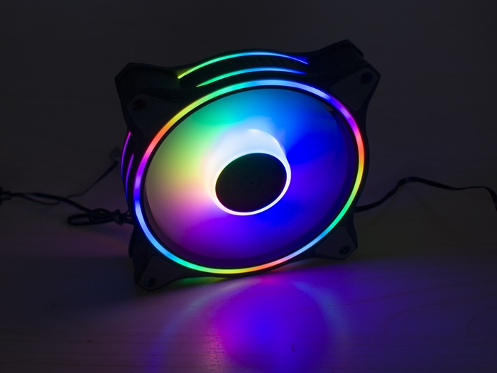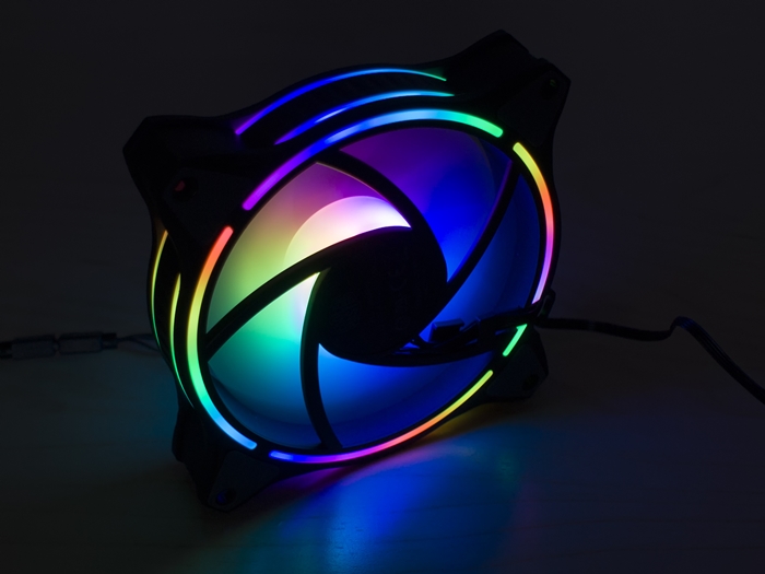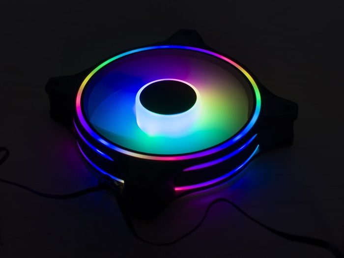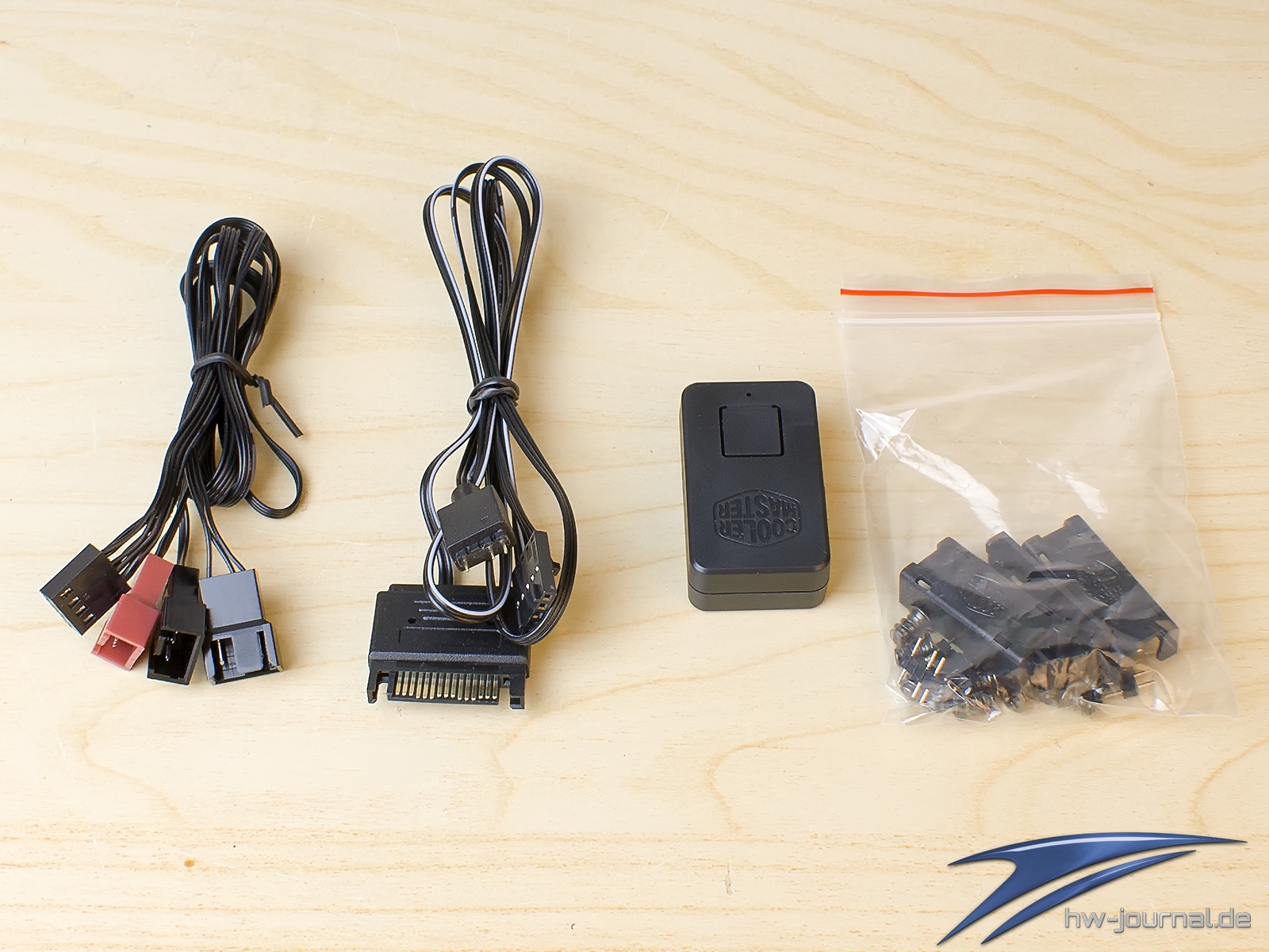 Zudem liegt dem Dreierpack ein 3 in 1 PWM Splitter bei, sodass man die drei Lüfter an einem Fan-Header betreiben kann. Auch ein ARGB-Controller ist enthalten. Dieser liegt bspw. auch beim Cooler Master MasterAir MA620M bei. Er hält zwei Effekte sowie die Farben Rot, Grün und Blau bereit. Durchschalten lässt er sich mittels aufgebrachtem Taster oder einem externen Taster (z. B. Reset-Knopf des Gehäuses). Ansonsten kann man die Beleuchtung der Lüfter auch an üblichen ARGB-Headern der verschiedenen Mainboard-Hersteller betreiben (3-Pin, 5V).