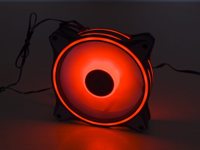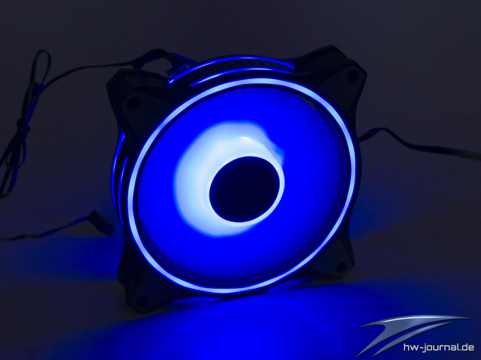 Wie die Beleuchtung in Aktion aussieht, zeigen die folgenden Bilder kurz. Halos (= Heiligenscheine) sind an Vorder- und Rückseite vorhanden sowie zweifach im Rahmen selbst. Die zweite Zone ist in der Nabe vorhanden. Somit strahlt der Lüfter nicht nur kräftig, sondern auch eigentlich in alle Richtungen. Als Gehäuselüfter optimal, da man somit keine Einschränkungen bezüglich der Einbaurichtung unterliegt.