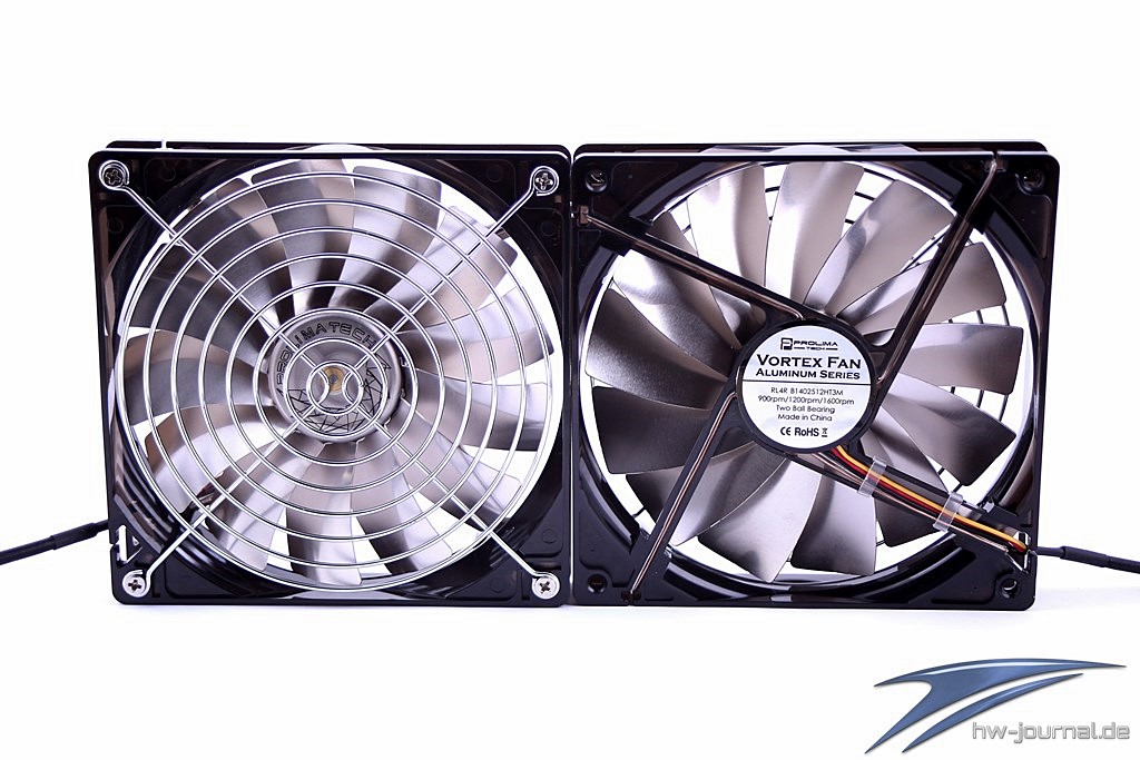 Die Lüfter werden mit Halteklammern, ohne eine extra Entkopplung am Kühler befestigt. Die Montage des Lüfters stellt keine Herausforderung dar, die Entkopplung vom Kühler ist dagegen als mangelhaft zu bezeichnen.