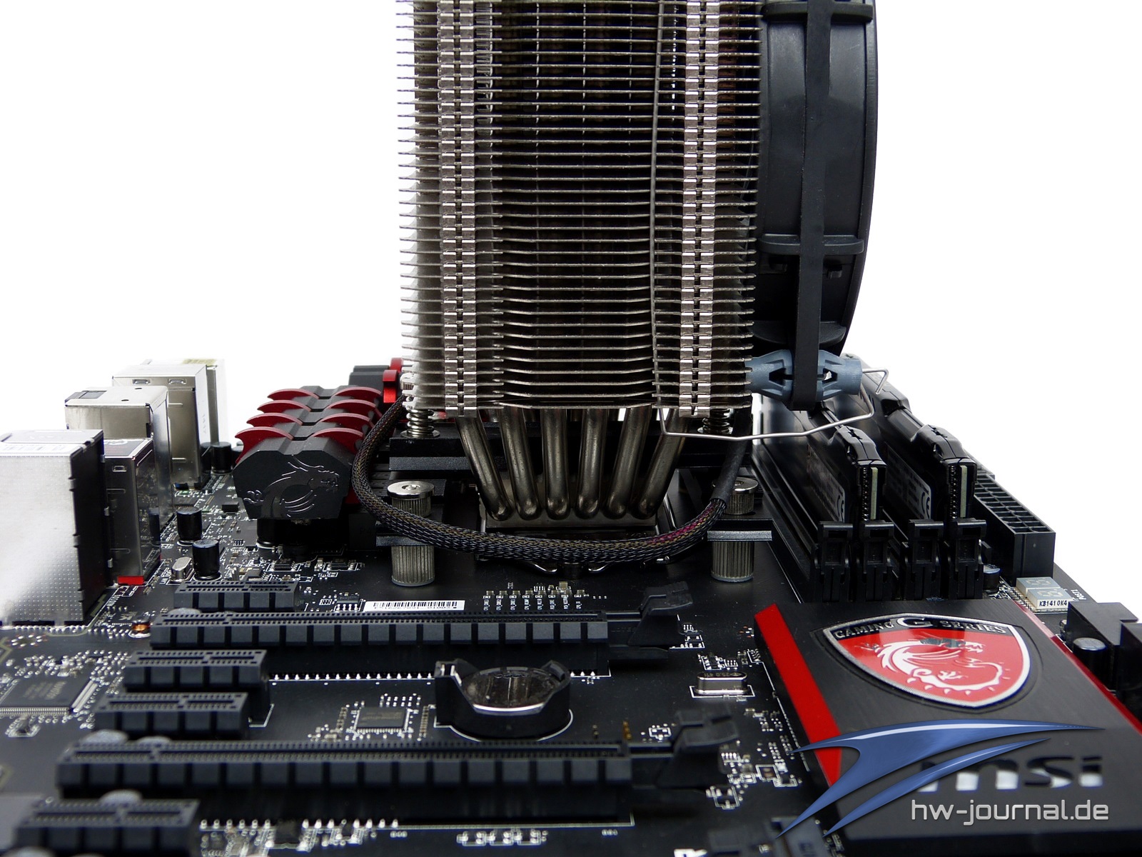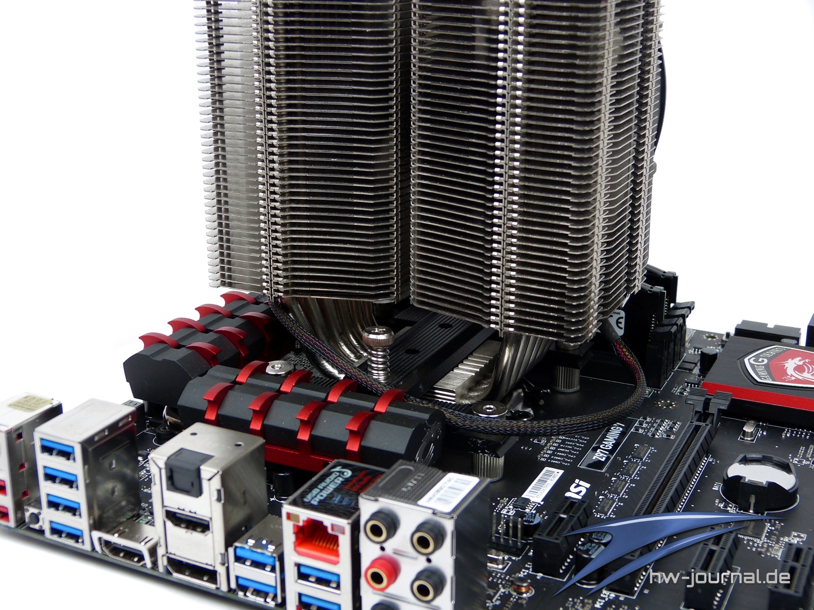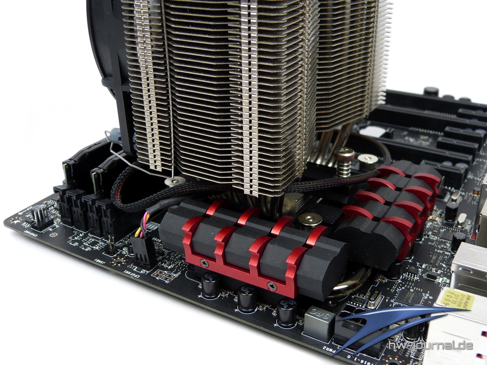 Bei der Kühlermontage haben wir auf ein bewährtes Modell aus dem Hause Prolimatech zurückgegriffen. Trotz des Alters hat der Megahalems genügend Leistungsreserven, um einen reibungslosen Betrieb zu ermöglichen. Die Montage erfolgte ohne jegliche Probleme. Die Kühler um den CPU-Sockel herum sind gut platziert und stören keineswegs. Jedoch sollte vor dem Kauf eines entsprechenden Kühlers auf jeden Fall ein Blick in die jeweilige Kompatibilitätsliste geworfen werden.