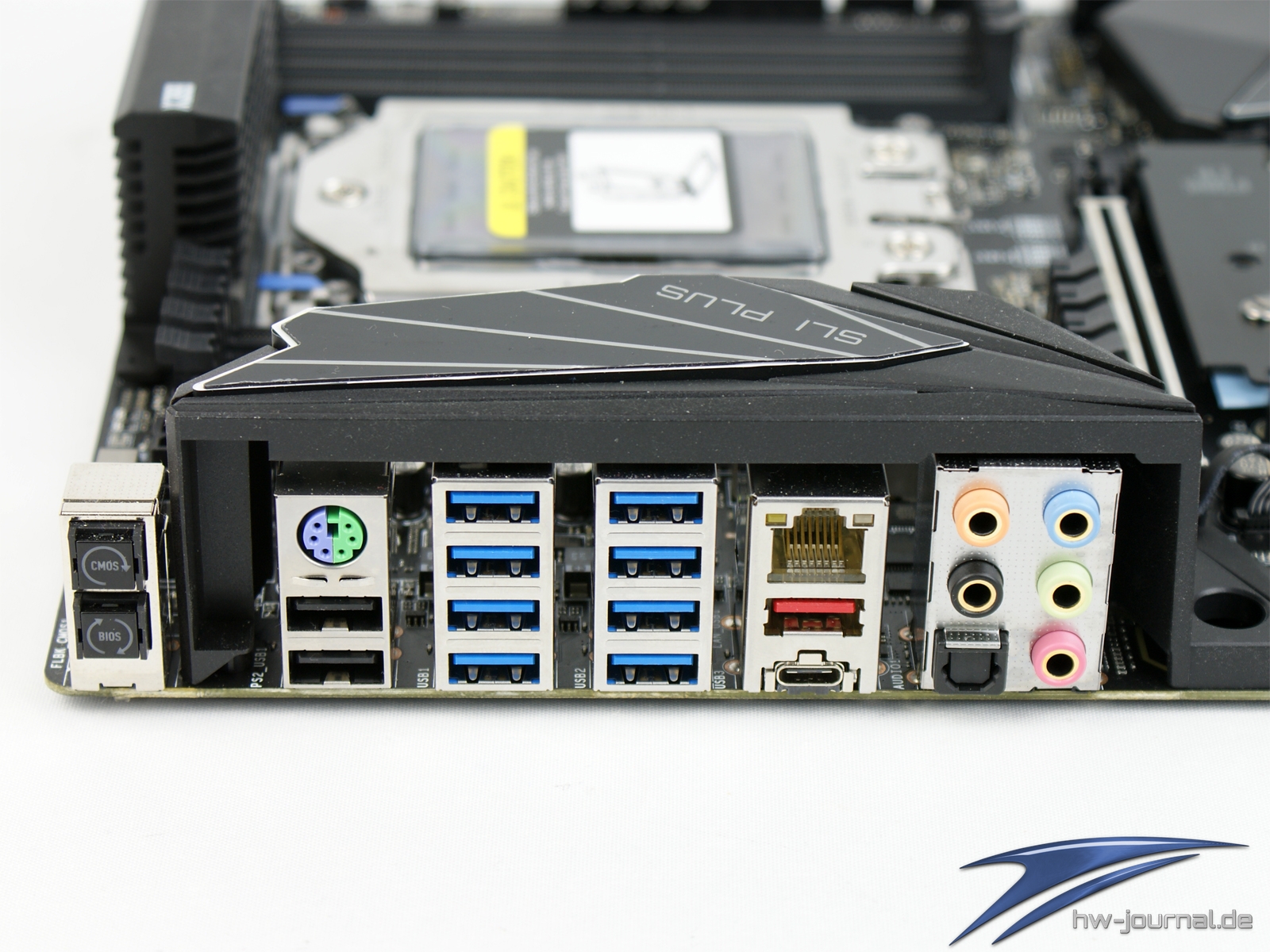 Des Weiteren findet man zwei USB 2.0, acht USB 3.1 Gen.1 (5Gbps) von welchen zwei als VR Ready bezeichnet werden sowie zwei USB 3.1 Gen.2 (10Gbps) als Typ-A und Typ-C. Auch ein PS/2 Anschluss hat es noch auf das Mainboard geschafft. In Hinblick, dass das Mainboard auch in einer Workstation benutzt werden könnte, eventuell vertretbar. Desweiteren ist ein Ethernet Anschluss sowie der digitlae und die analogen HiFi-Ausgänge vorhanden.