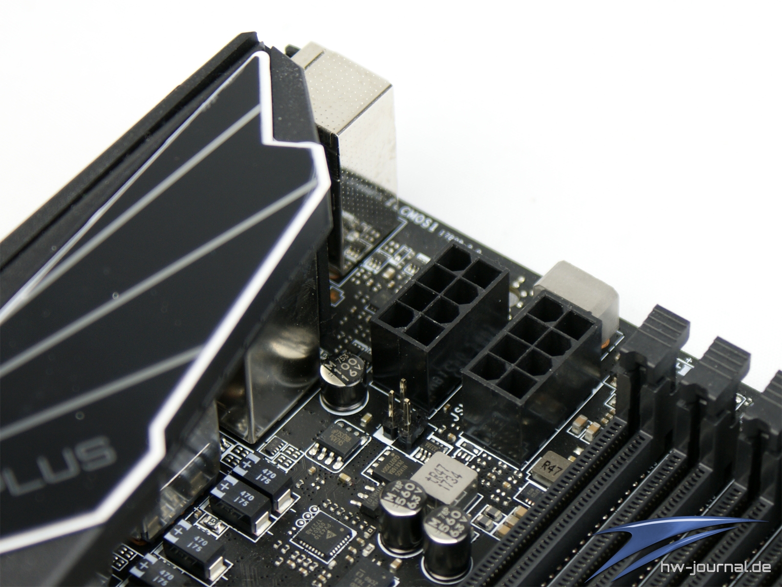 Wer hier die SoC Versorgung vermisst, liegt richtig. Diese befindet sich links neben den Speicherbänken. Ein IR35204 (3+1 PWM Controller) steuert hier drei IR3555M MOSFETs, welche ohne Kühlung auskommen müssen. Auch wenn hier, wie auch bei den CPU Phasen bis zu 60A pro Spannungswandler fließen können, werden diese bei weitem nicht os stark belastet, wie die CPU Phasen. Um den theoretischen Strom jedoch liefern zu können, setzt MSI auf zwei 8-Pin Stecker für die CPU. Dass diese hauptsächlich hier ihren Dienst verrichten müssen demonstriert der weitere 6-Pin Anschluss, welcher die PCIe Steckplätze mit zusätzlicher Energie speisen soll.