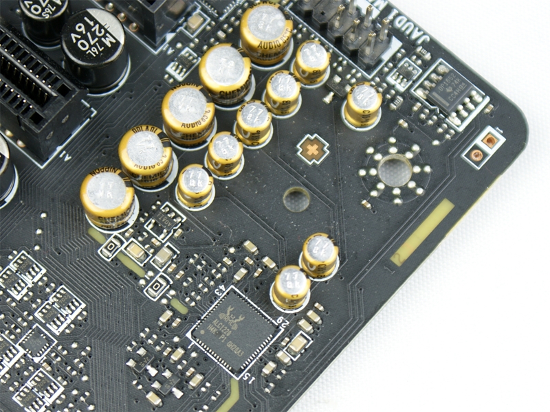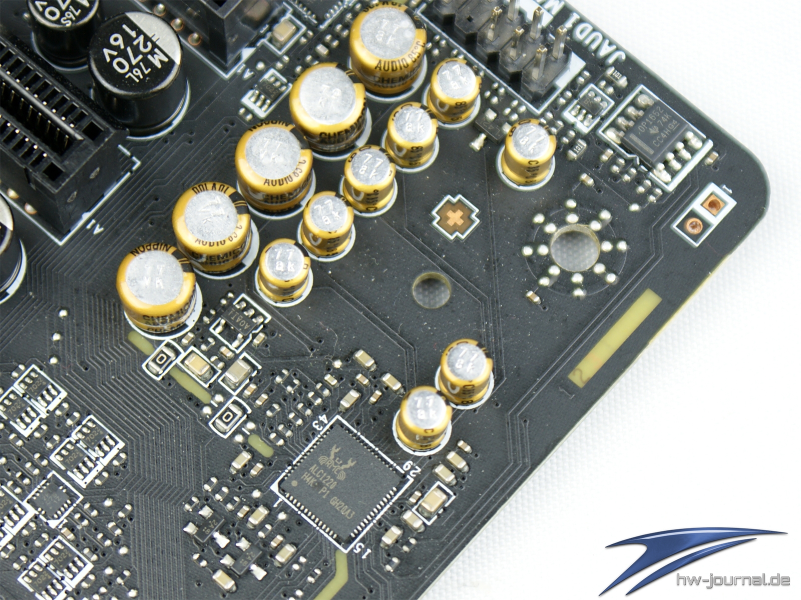 Beim HiFi Ausbau kommt der Realtek ALC1220 zum Einsatz, welcher aktuell wohl den besten OnBoard Soundchip darstellen sollte. Um die Qualitäten des Chips auszuspielen, setzt MSI weiterhin auf hochwertige Chemi-Com Kondensatoren, welche für einen warmen Klang sorgen sollen. Desweiteren wird ein Audio OP Verstärker in Form des Texas Instruments OPA1652 eingesetzt. Dieser ermöglich es, auch sehr hochohmige Kopfhörer einzusetzen.
